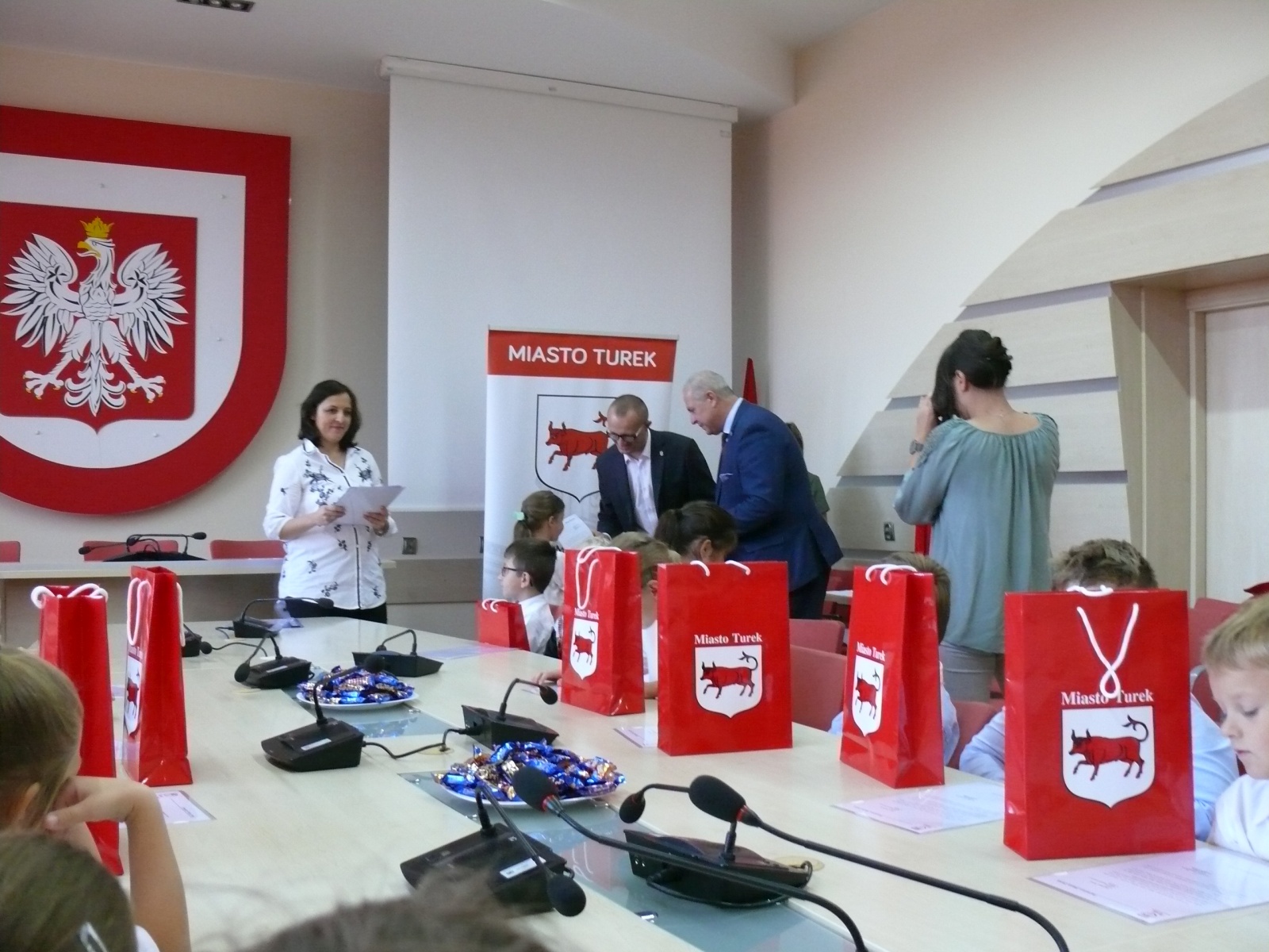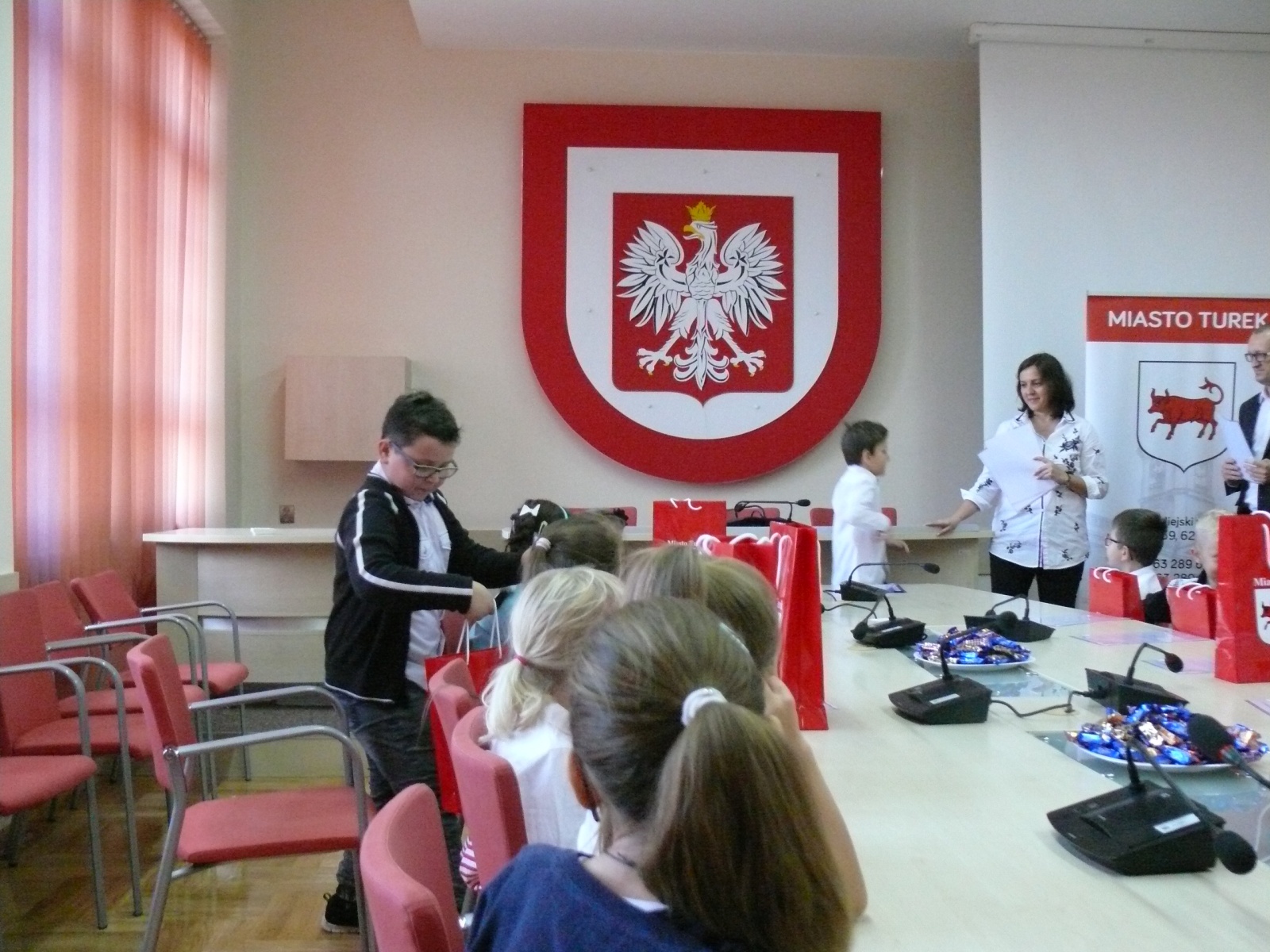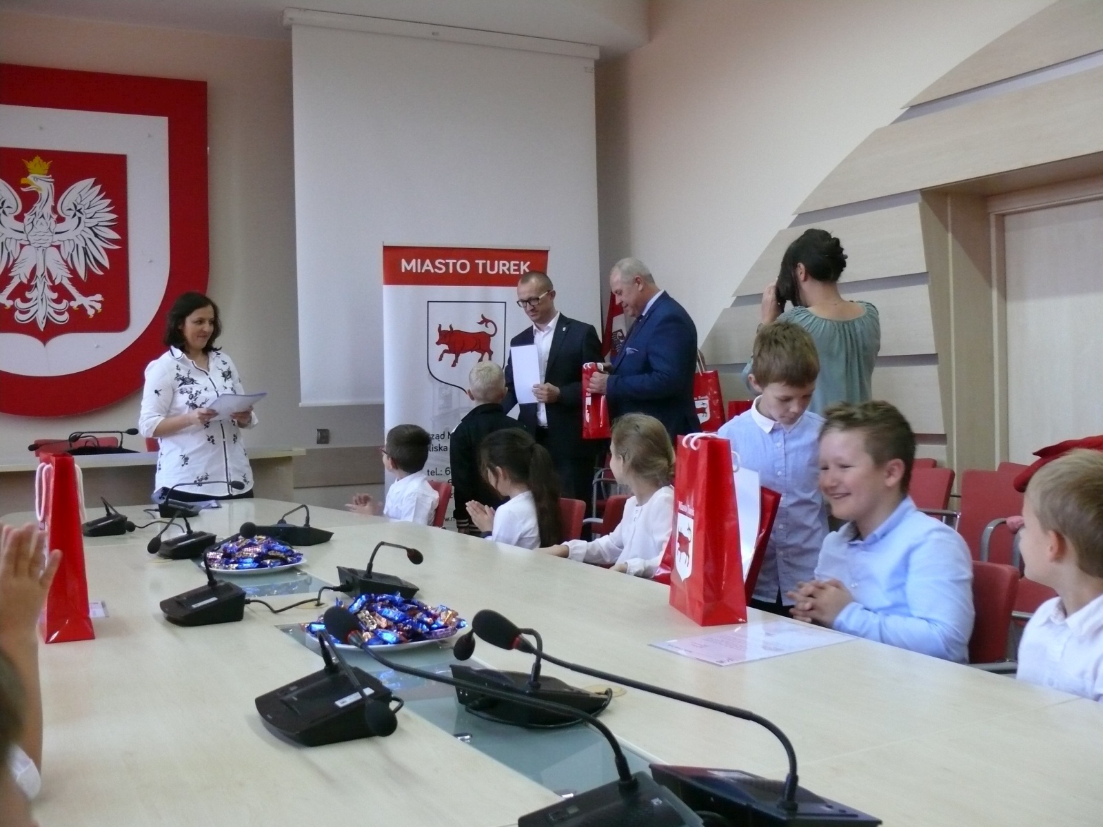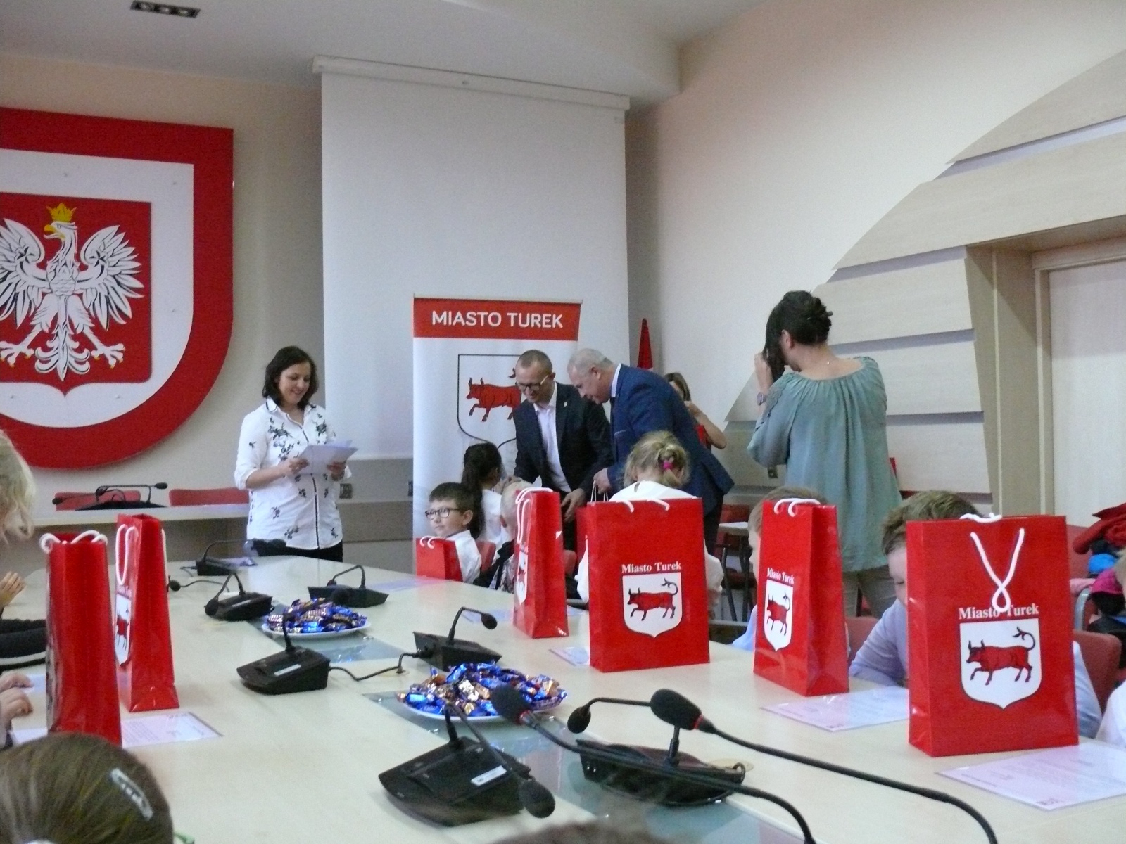 Podczas wizyty w UM włodarze miasta uhonorowali laureatów, wręczając im pamiątkowe dyplomy i upominki. Dzieci były bardzo przejęte wizytą i dumne z osiągniętego sukcesu.