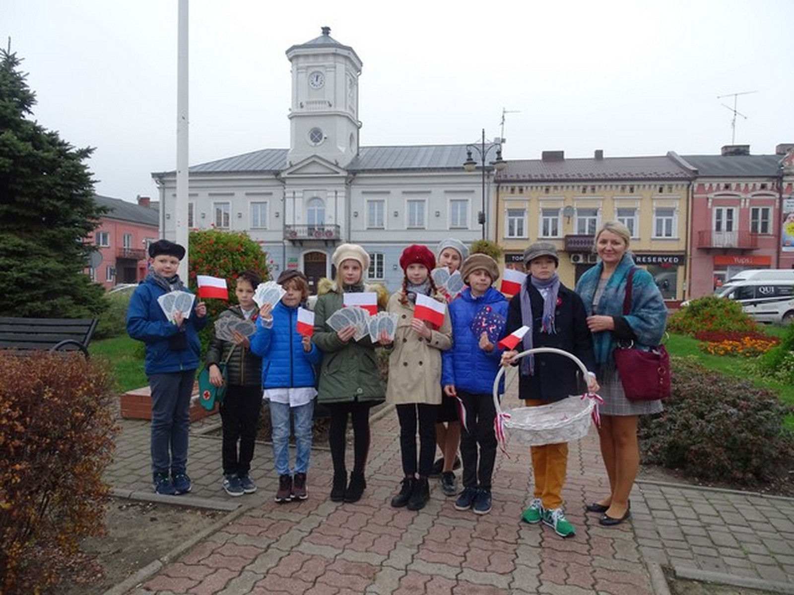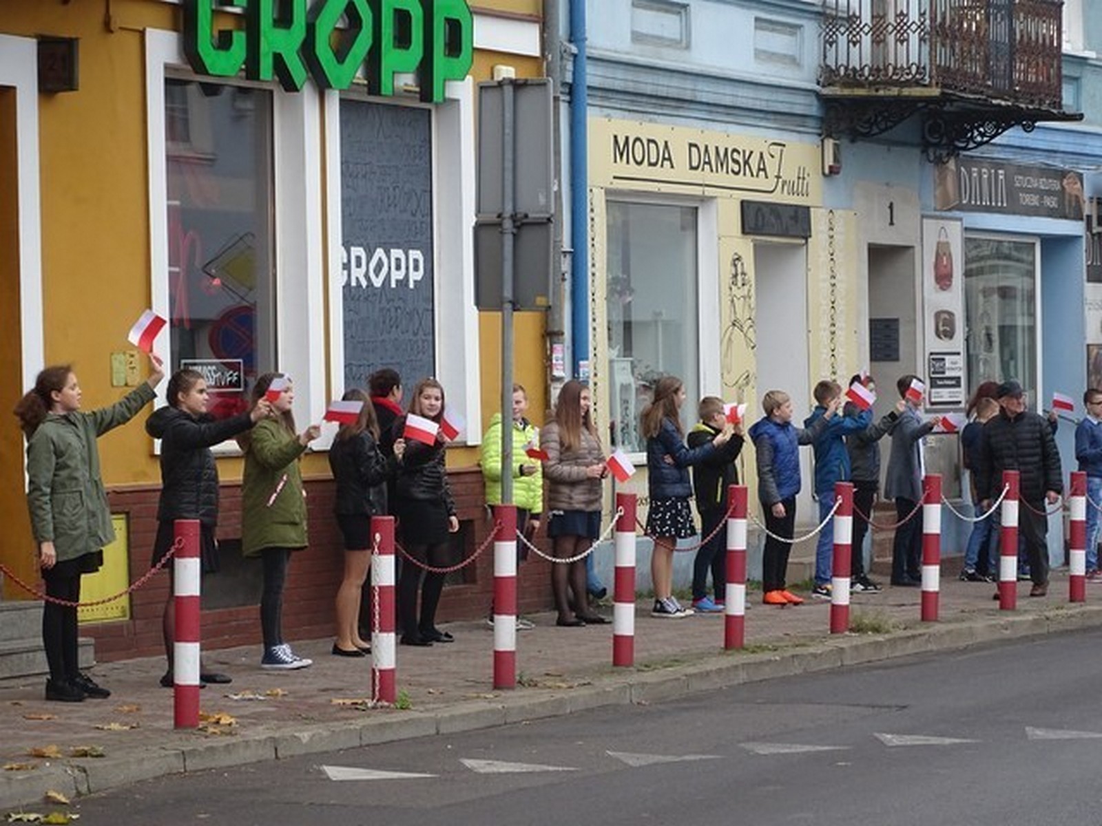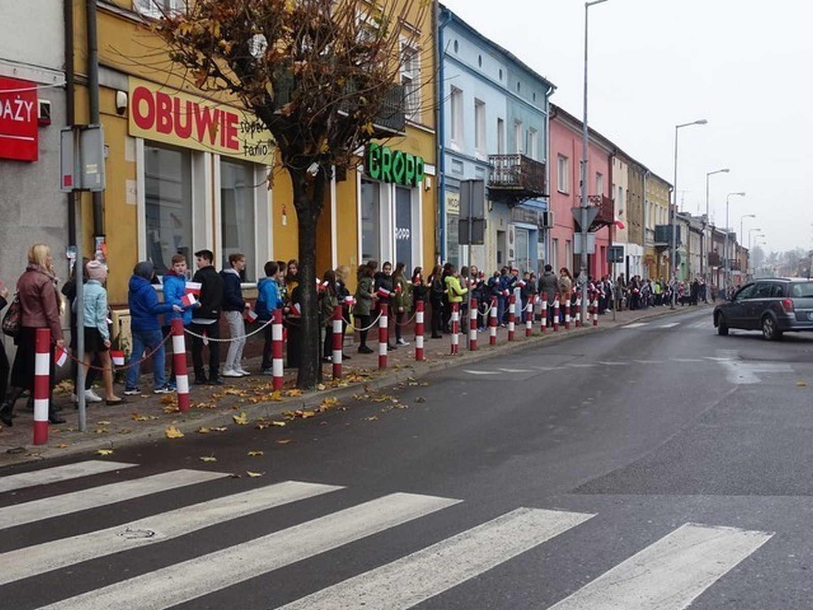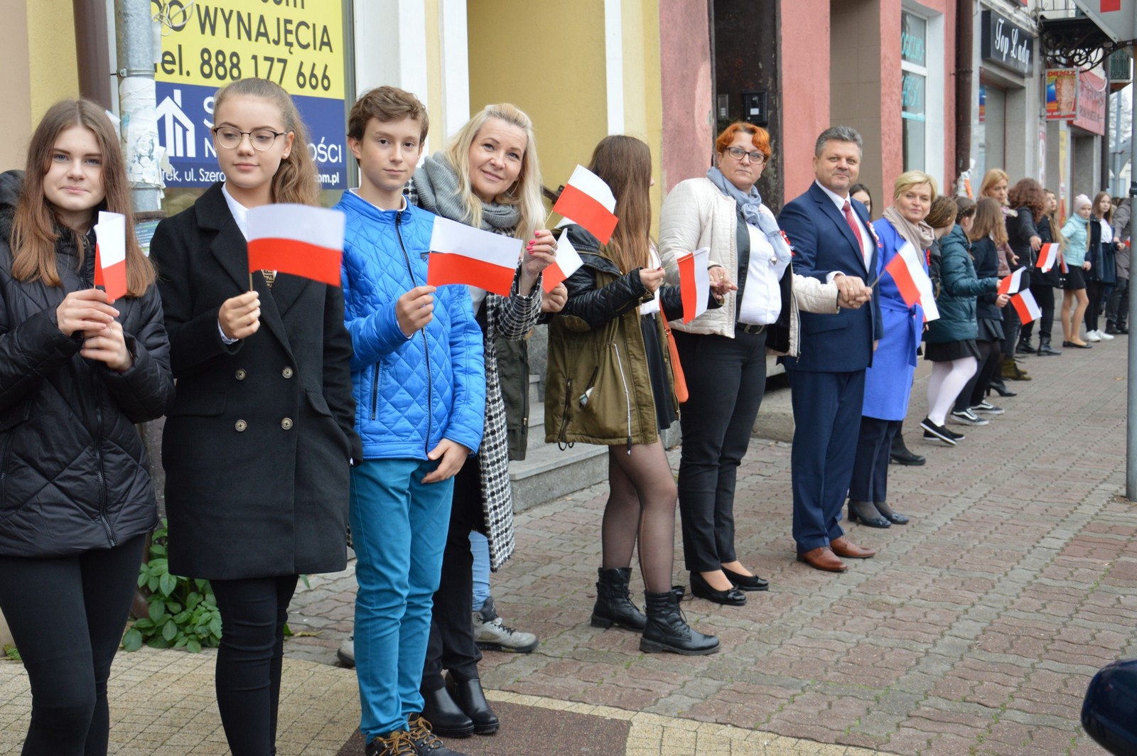 O godz.11.11 –wszyscy uczniowie i nauczyciele włączyli się do ogólnopolskiej akcji i uroczyście odśpiewali hymn państwowy przed budynkami szkoły. Po zakończeniu hymnu państwowego uczniowie klas I – VIII oraz oddziały gimnazjalne utworzy Łańcuch Niepodległości, wzdłuż ulic naszego miasta, łączących oba budynki szkoły, od ul. 3 Maja do ul. Parkowej. Do Łańcucha przyłączyli się przechodnie, zachęcani do udziału w tej akcji z balkonu miejskiego Ratusza. Byli to uczniowie: Hubert Majka, Jakob Loba, Weronika Karolak, Michalina Stasiak.