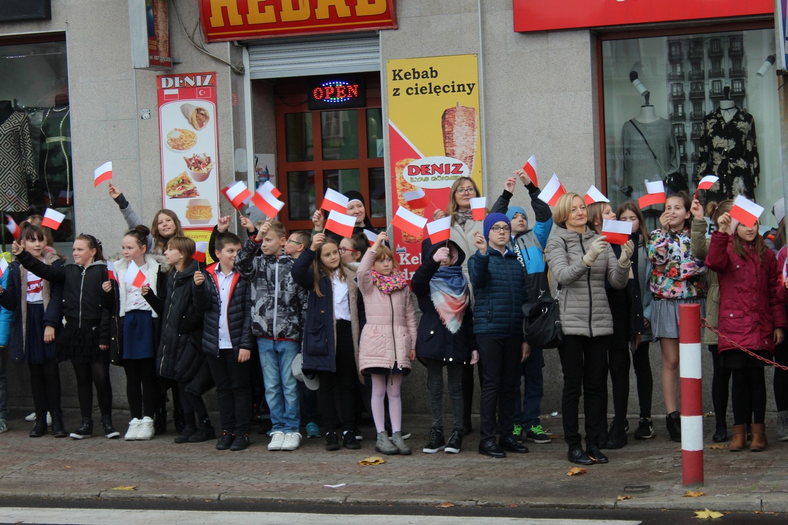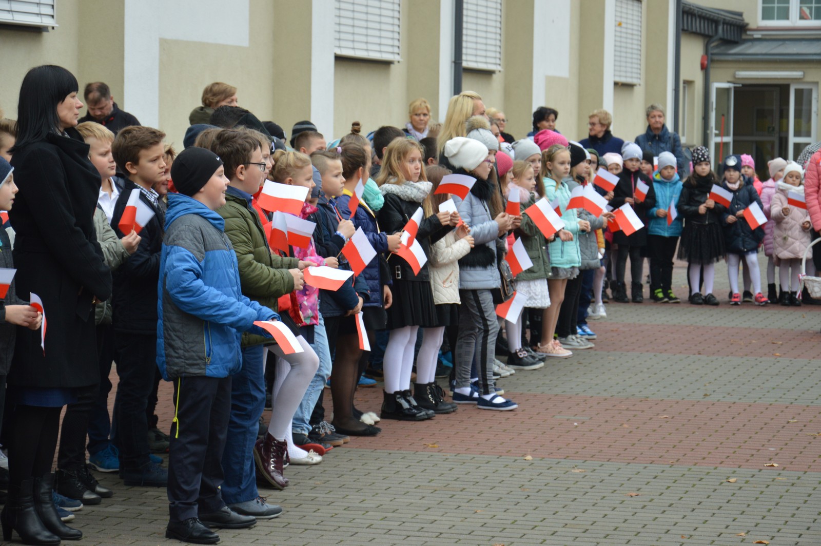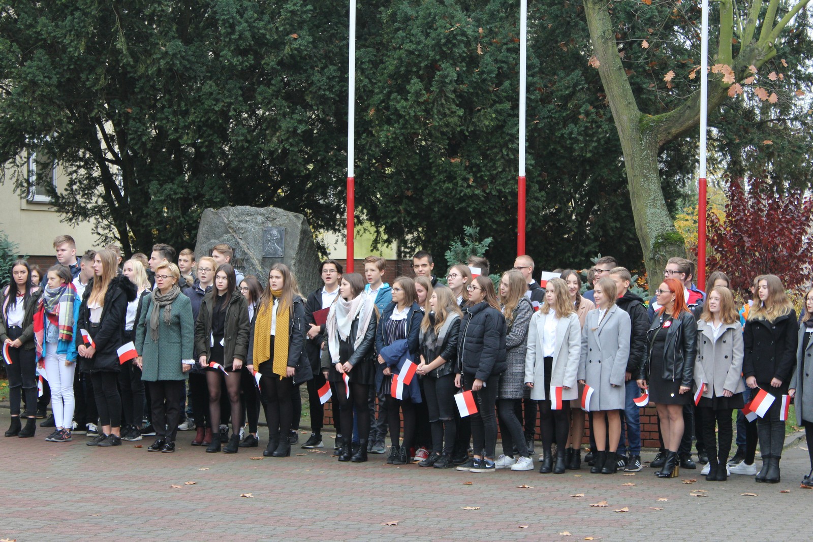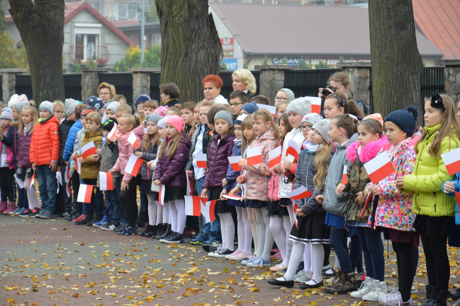 O godz.11.11 –wszyscy uczniowie i nauczyciele włączyli się do ogólnopolskiej akcji i uroczyście odśpiewali hymn państwowy przed budynkami szkoły. Po zakończeniu hymnu państwowego uczniowie klas I – VIII oraz oddziały gimnazjalne utworzy Łańcuch Niepodległości, wzdłuż ulic naszego miasta, łączących oba budynki szkoły, od ul. 3 Maja do ul. Parkowej. Do Łańcucha przyłączyli się przechodnie, zachęcani do udziału w tej akcji z balkonu miejskiego Ratusza. Byli to uczniowie: Hubert Majka, Jakob Loba, Weronika Karolak, Michalina Stasiak.