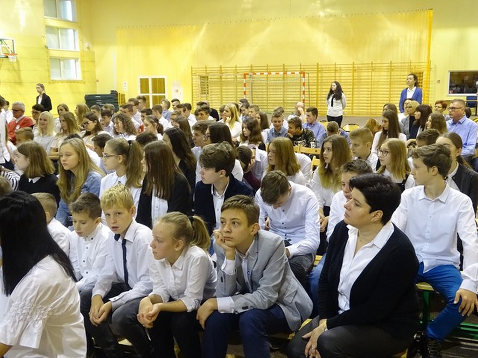 Uroczysty apel z udziałem całej społeczności szkolnej prowadzili uczniowie III klasy gimnazjalnej: Kinga Piskuła i Hubert Kozelan.