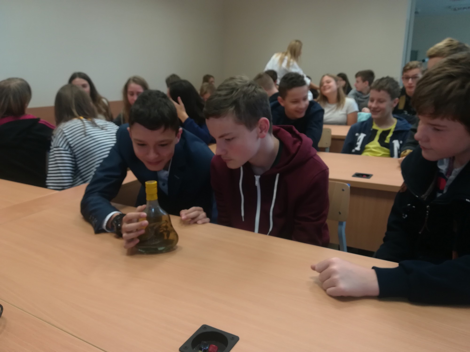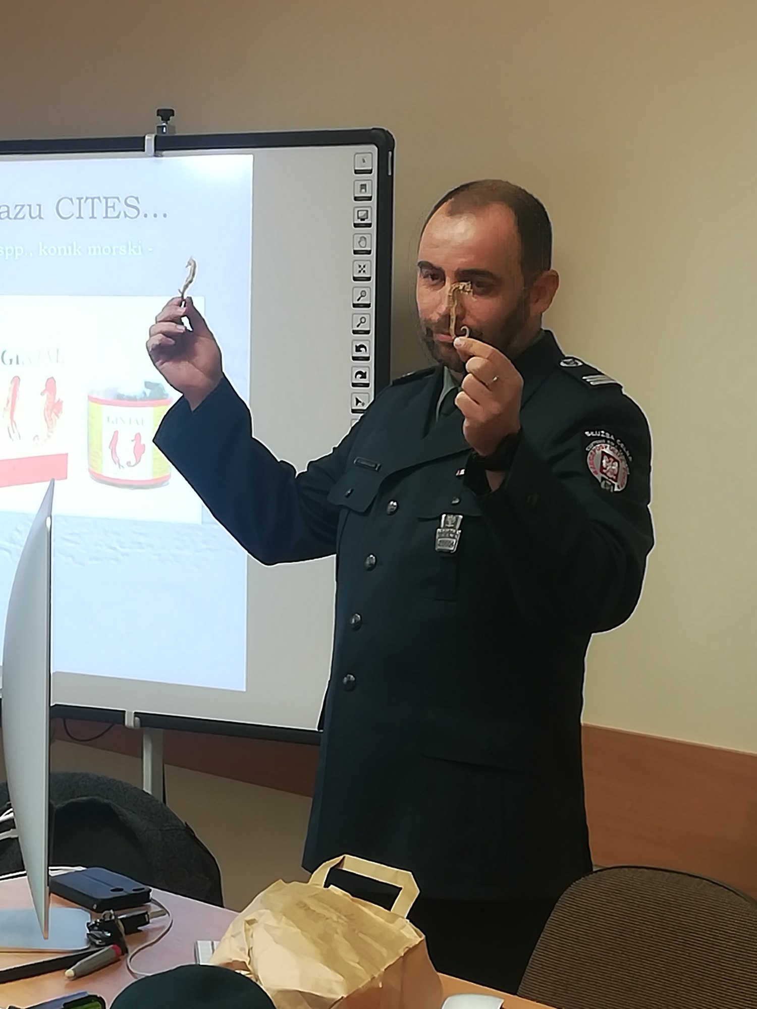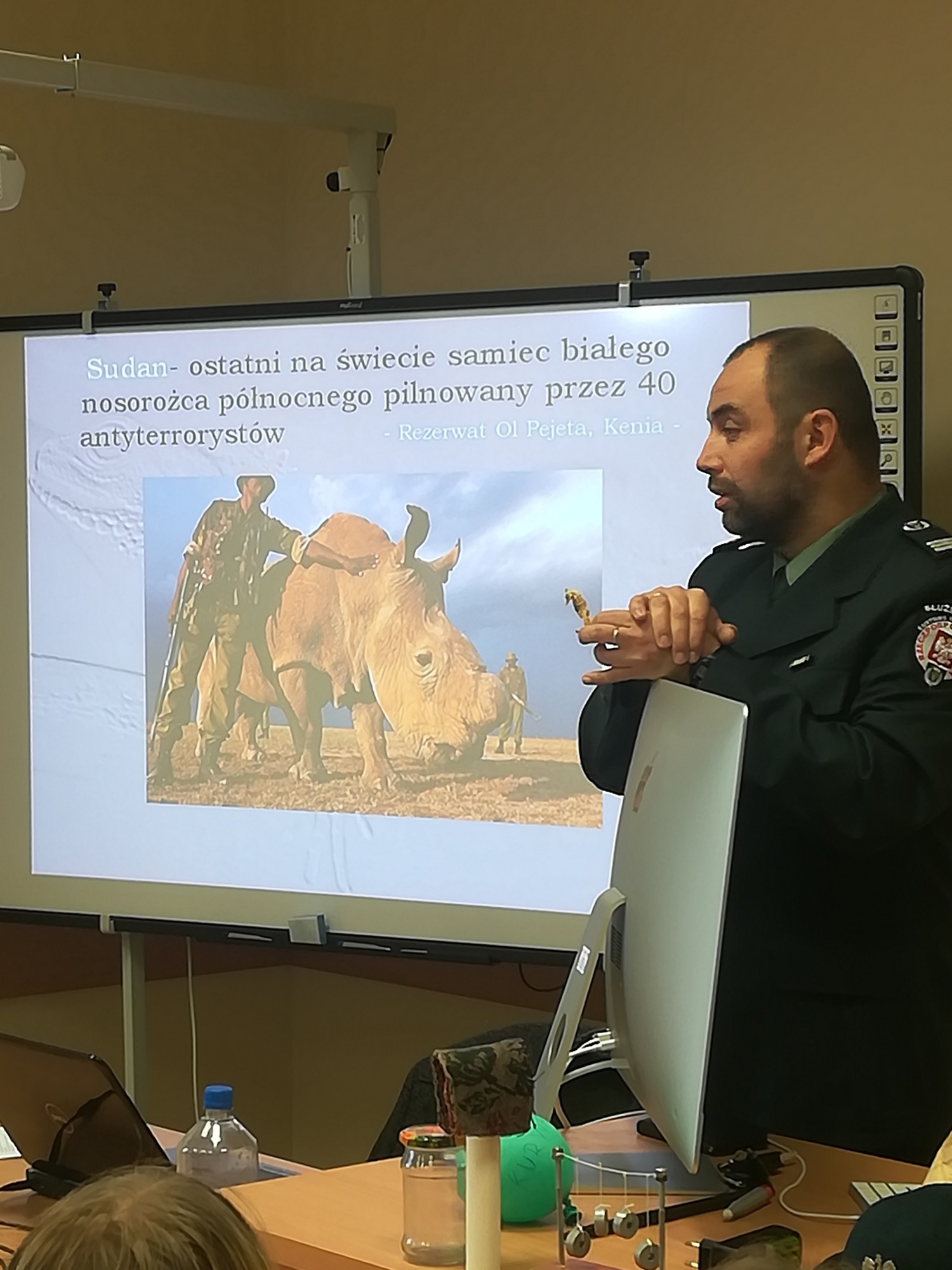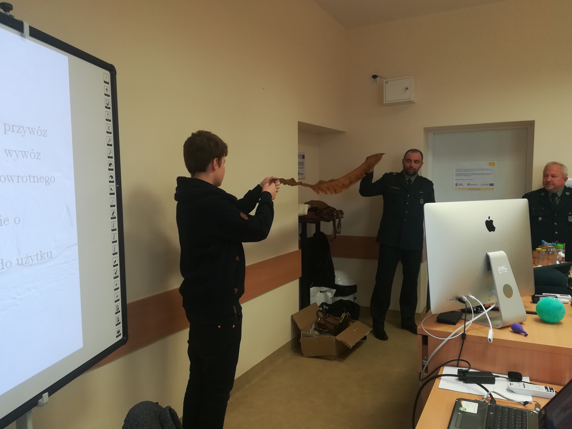 Dnia 13.11.2018 r. uczniowie klasy 8 c i 8b mieli możliwość poznania specyfiki zawodu celnika, bowiem do naszej szkoły zawitali przedstawiciele służby celnej z Kalisza. Panowie przedstawili młodzieży zasady swojej pracy oraz namiastkę obowiązujących przepisów celnych. Na spotkaniu pokazali przedmioty, które zostały zarekwirowane podróżnym podczas kontroli na lotnisku. Były to m.in.: torebka ze skóry krokodyla, skórzane buty, grzechotka ze skorupy żółwia, skóra węża, butelka z kobrą i skorpionem w środku. Tym faktem uświadomili młodzieży, że nie wszystko co można traktować jako pamiątkę z wakacji, jest legalne a posiadanie takich przedmiotów podlega karze.