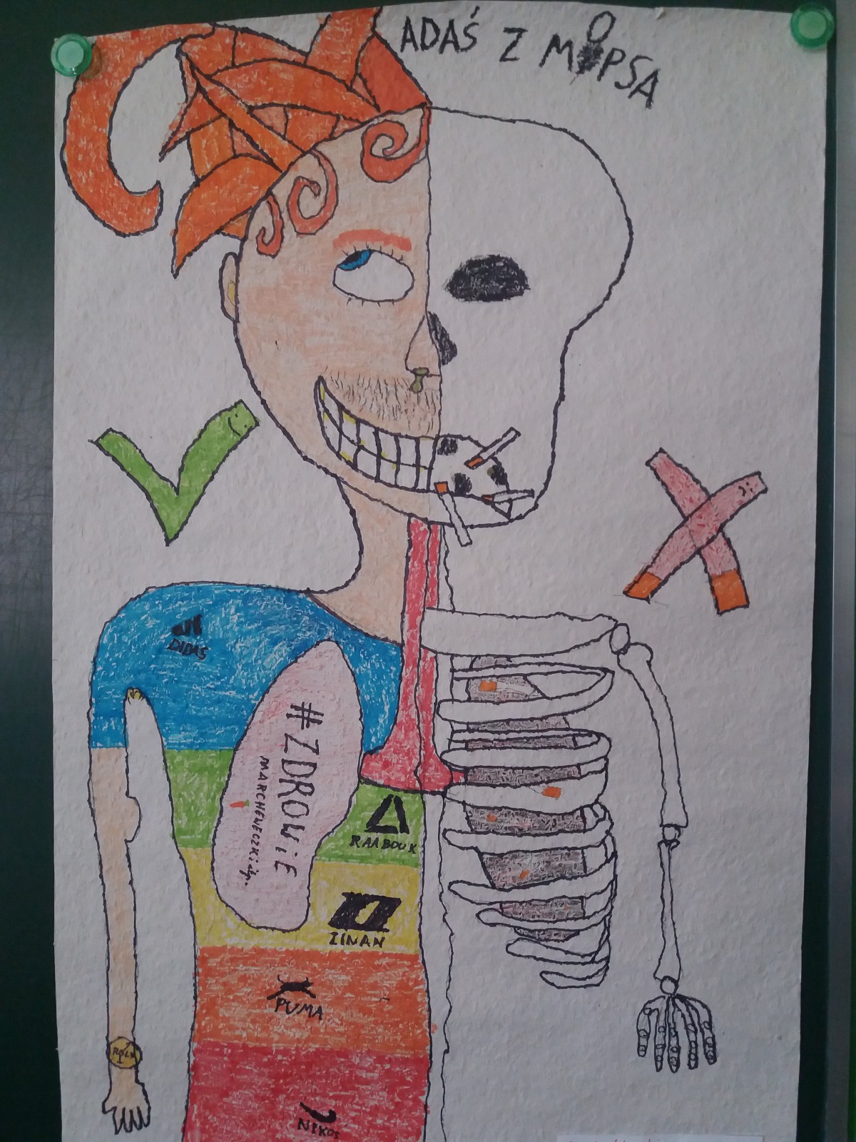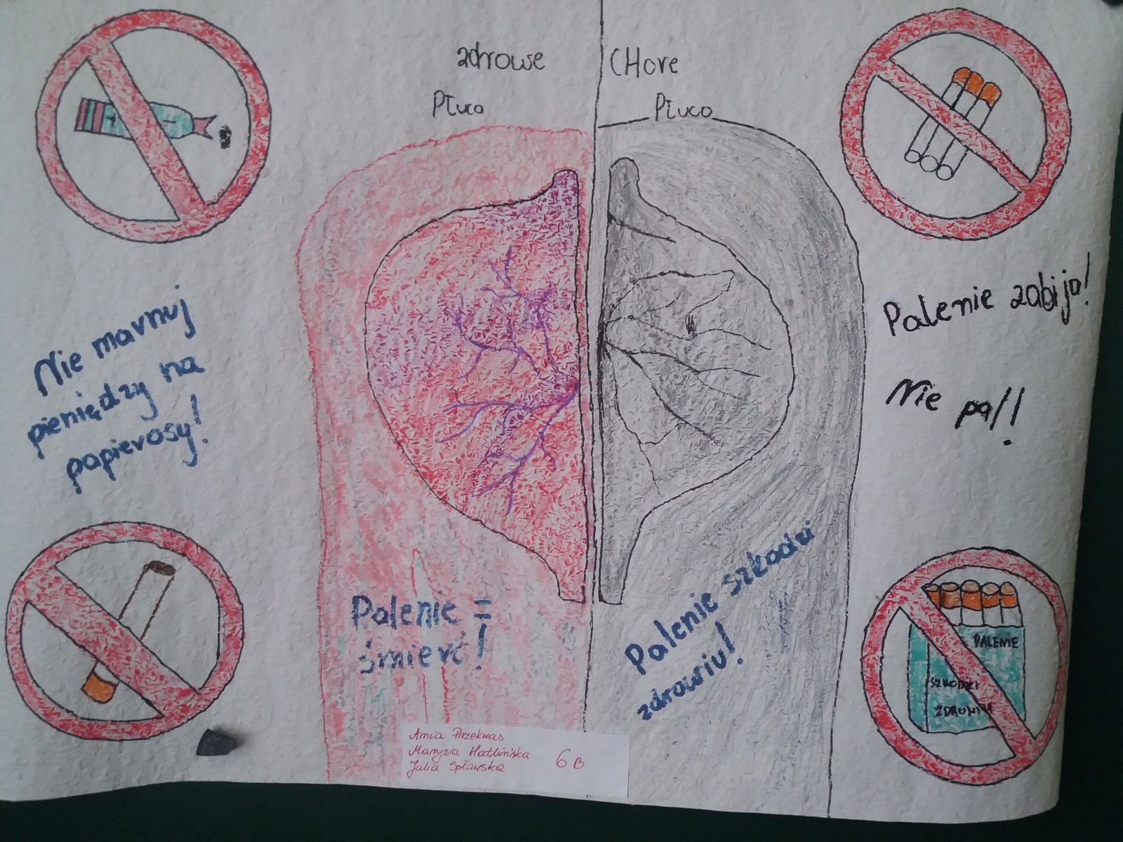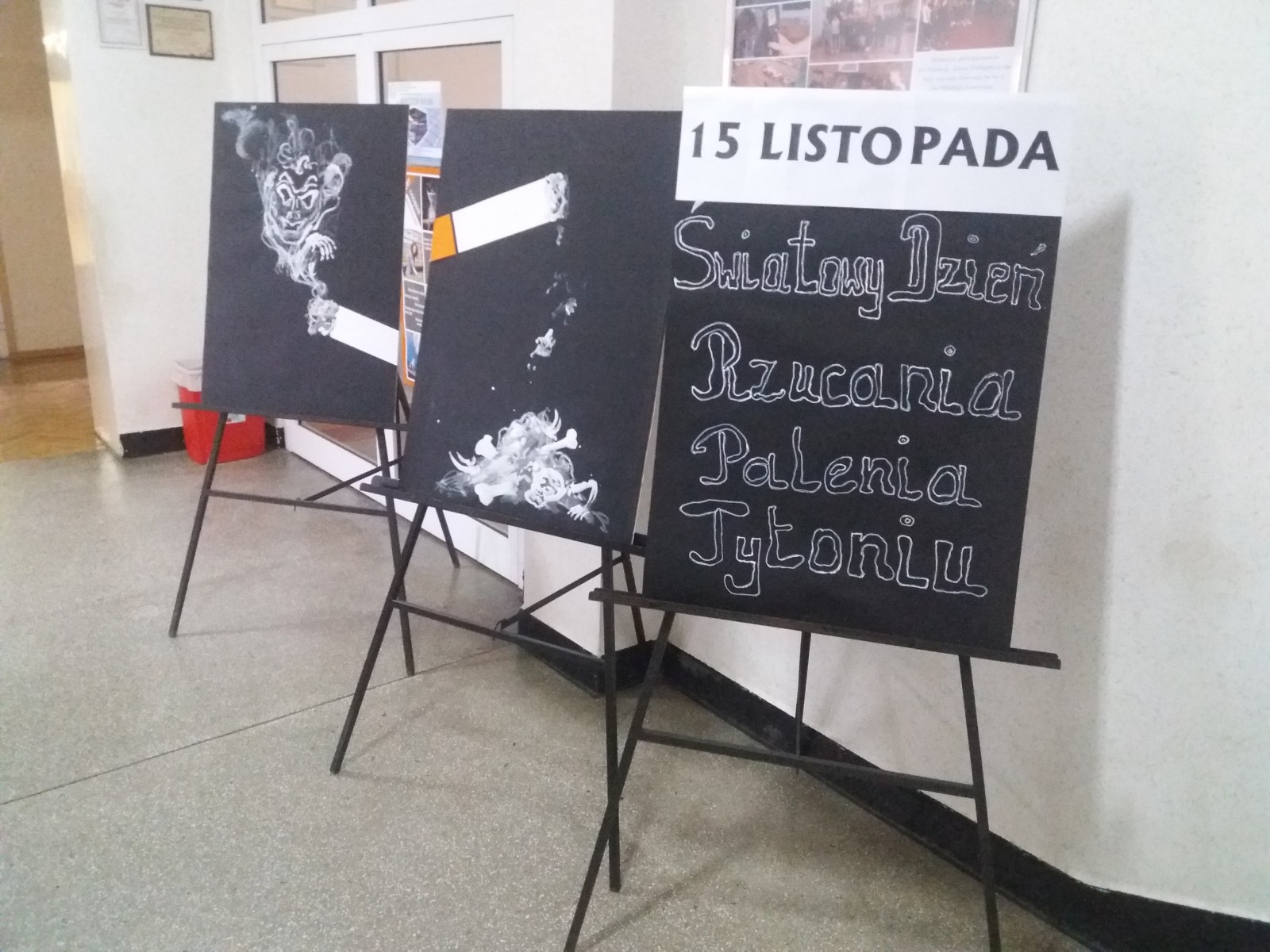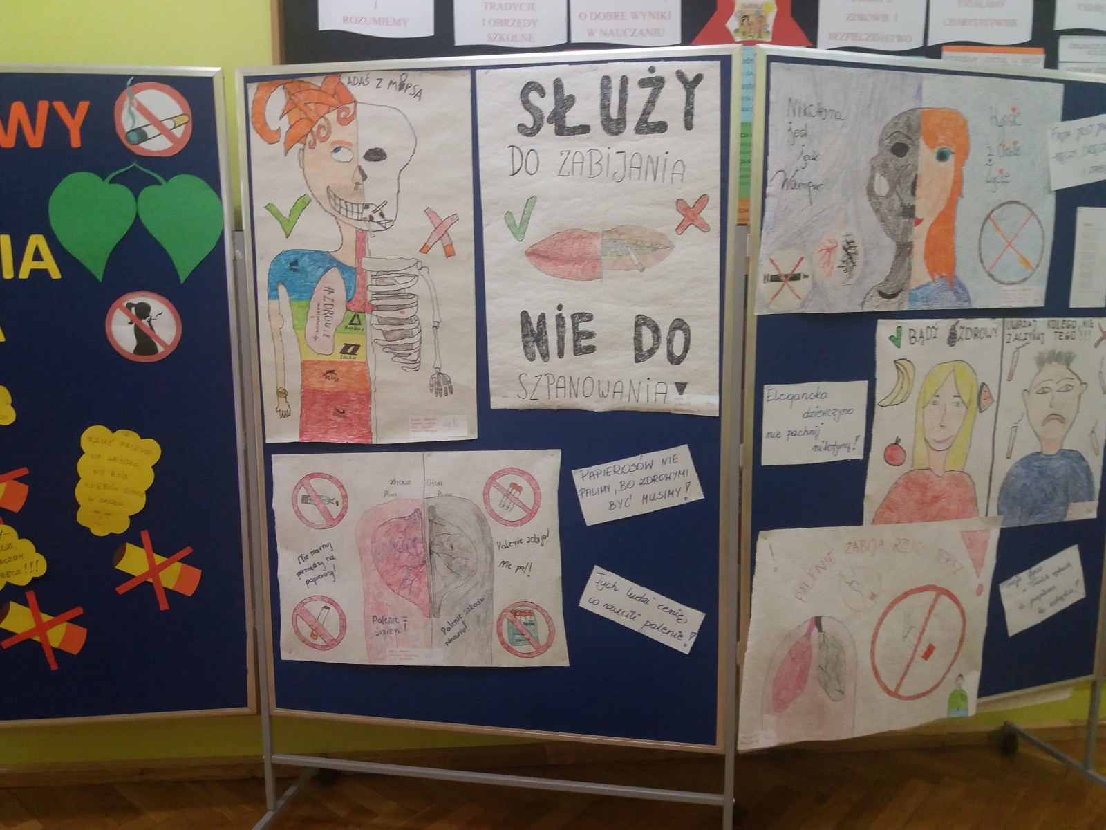 W dniach od 15 do 22 listopada obchodziliśmy „Światowy Dzień Rzucania Palenia”. W każdej klasie od I do VIII SP i III GIM odbyły się lekcje o tematyce „Papierosy są niemodne i niezdrowe – skutki palenia tytoniu”. W klasach IV pani pielęgniarka opowiedziała o szkodliwości palenia tytoniu oraz o innych uzależnieniach. W klasach VII-VIII i III Gim przeprowadzono diagnozę uczniów w zakresie używania środków psychoaktywnych, w tym papierosów i e-papierosów oraz prelekcja pracowników Ośrodka Wsparcia dla Osób z Problemami Uzależnień w Turku na temat „Szkodliwości palenia tytoniu i e-papierosów”. Na korytarzach w budynku A i B pojawiły się wspaniałe gazetki oraz wystawa plakatów klas szóstych propagujące szkodliwość palenia papierosów. Podczas wywiadówek rodzice otrzymali informacje o przeprowadzonej akcji, natomiast w klasach VI i VII zaproszono rodziców na spotkanie z funkcjonariuszem policji z Komendy Powiatowej Policji w Turku na której rozmawiano o rozpoznawaniu zagrożeń w środowisku młodzieży.