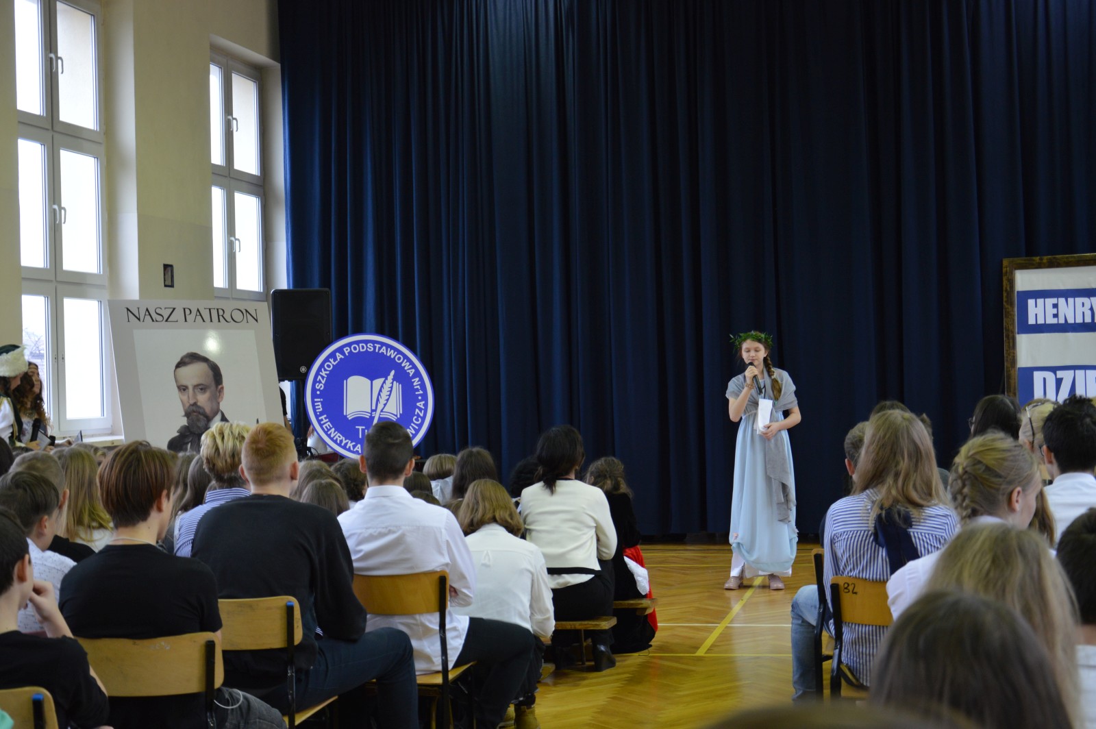 Teatr „Szpilka” i klasa 6c pokazali przedstawienie „Przybywajcie na wezwanie … z bohaterami Sienkiewicza na spotkanie”. Kiedy pojawiła się Paula Biskup, mocno i podniośle zabrzmiał w jej wykonaniu hymn „Quo Vadis Domine” oznaczało to, że uroczystość Dnia Patrona w „Jedynce” właśnie się rozpoczęła..