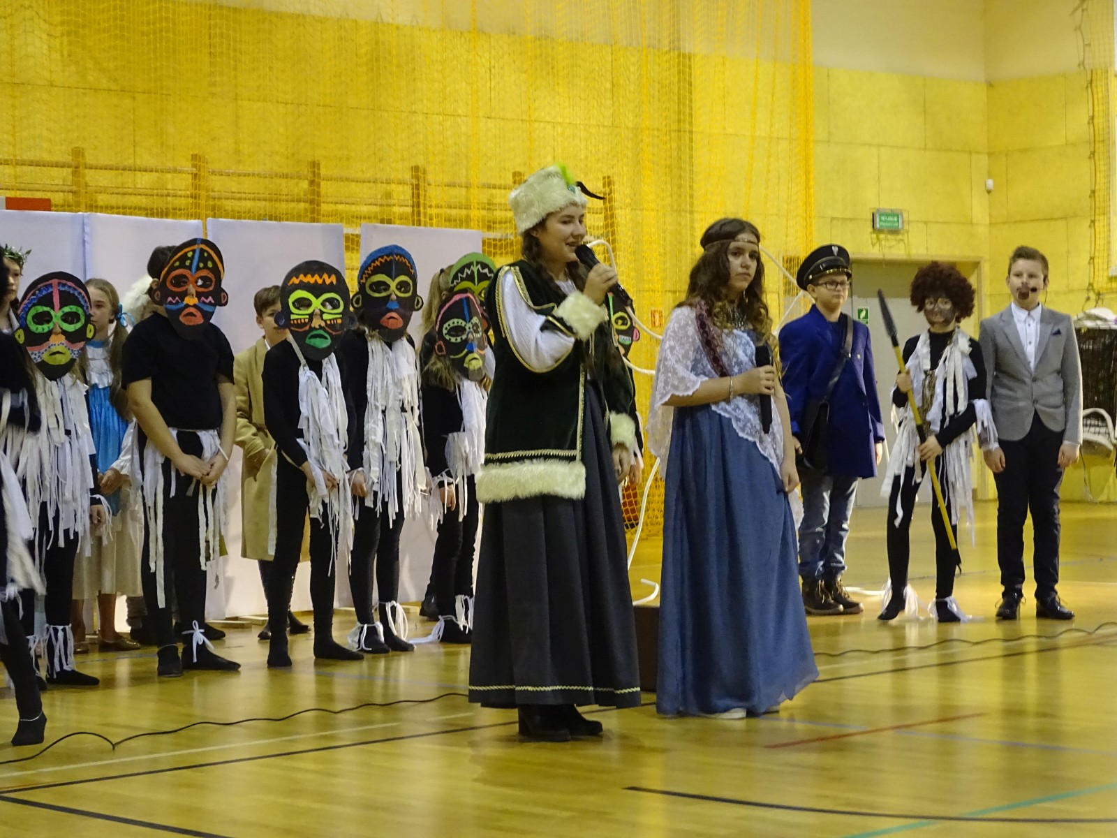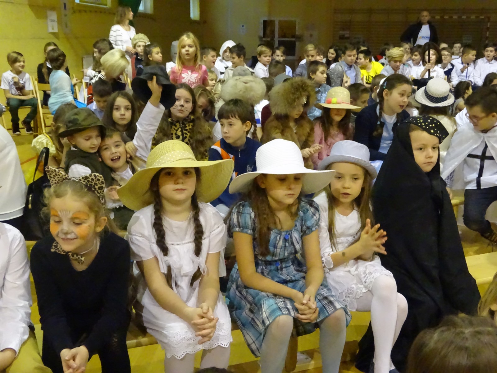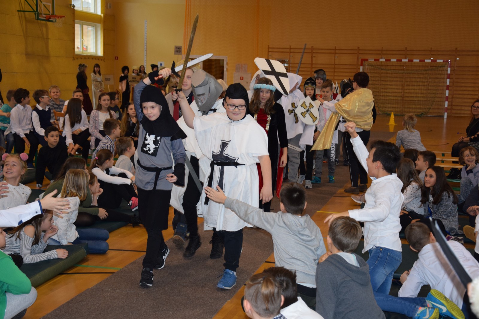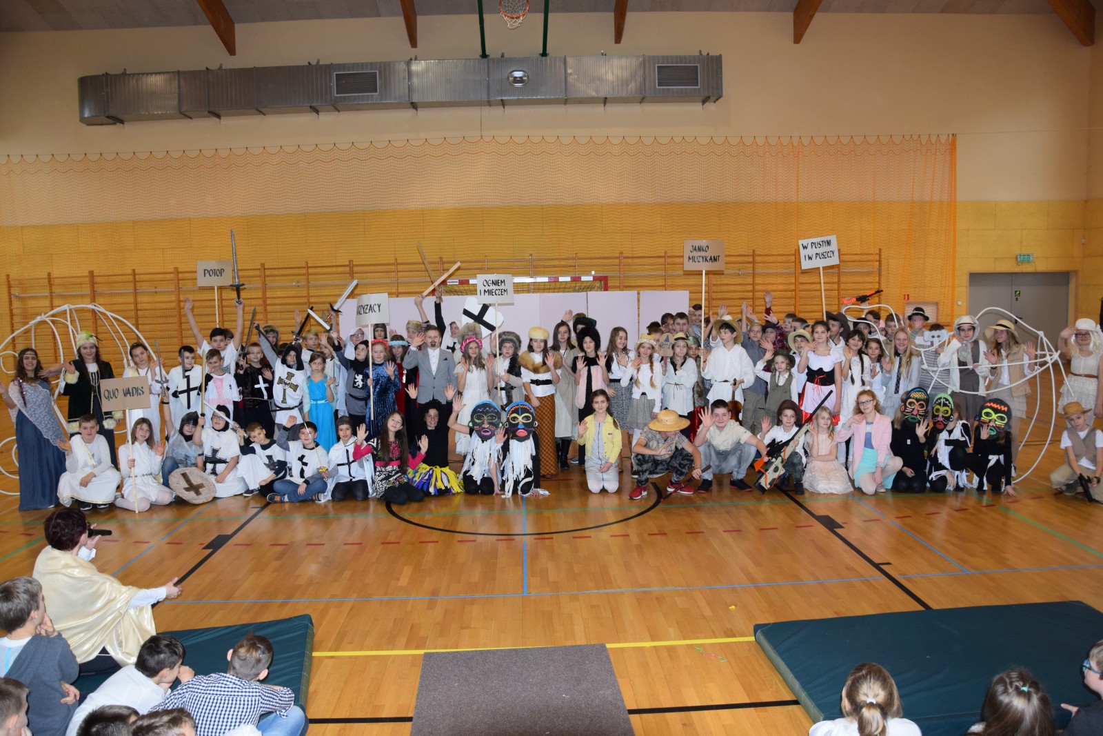 Młodzi aktorzy w zabawny sposób przybliżyli twórczość Henryka Sienkiewicza. Na spotkanie przybyli bohaterowie z „Potopu”, „Ogniem i mieczem”, „ Krzyżaków”, „W pustyni i w puszczy” i innych utworów. Przedstawienie wzbudzało zaciekawienie, humor a także element grozy. Przykładem była scena, kiedy kat miał ściąć głowę Zbyszka z Bogdańca, ale Danusia wstawiła się za nim wypowiadając słowa: „Mój ci on jest”. Zaskoczeniem dla publiczności było pojawienie się współczesnego listonosza, który przybiegł z listem od samego Sienkiewicza. Na spotkanie przybył w końcu on sam i odczytał „Dekalog” zaczynający się od słów: „ Jam jest Henryk Sienkiewicz, Wielka Wielkość Twoja, którym Cię wywiódł na pole sławy wszechświatowej”. Weseli Murzyni zatańczyli wg afrykańskich rytmów. Przedstawienie teatralne wzbogacały efekty plastyczne oraz zachwycający śpiew uczniów. Amelia Sobczyk i Bartosz Dziamara wzruszyli wszystkich, kiedy wykonali piosenkę „Dumka na dwa serca”. Na koniec przedstawienia swobodny rap i słowa piosenki podkreśliły, że Henryk Sienkiewicz jest Patronem znanym i lubianym.
