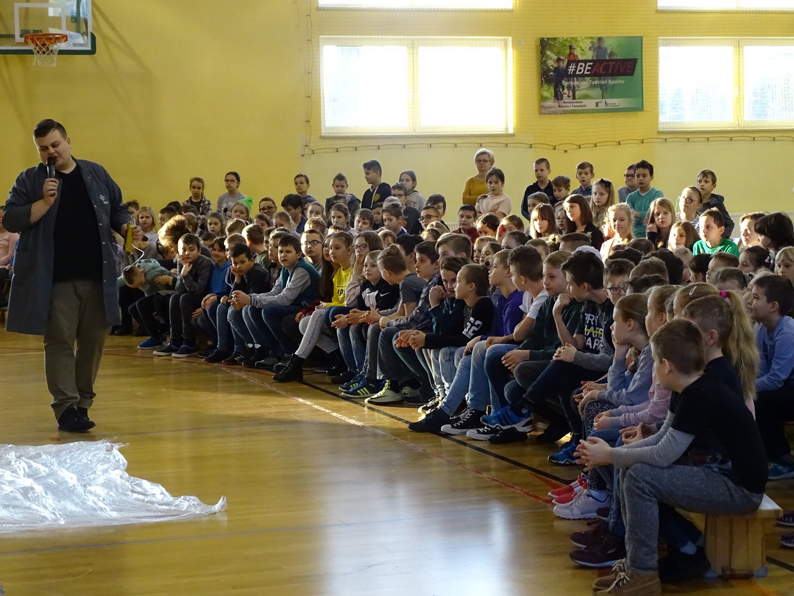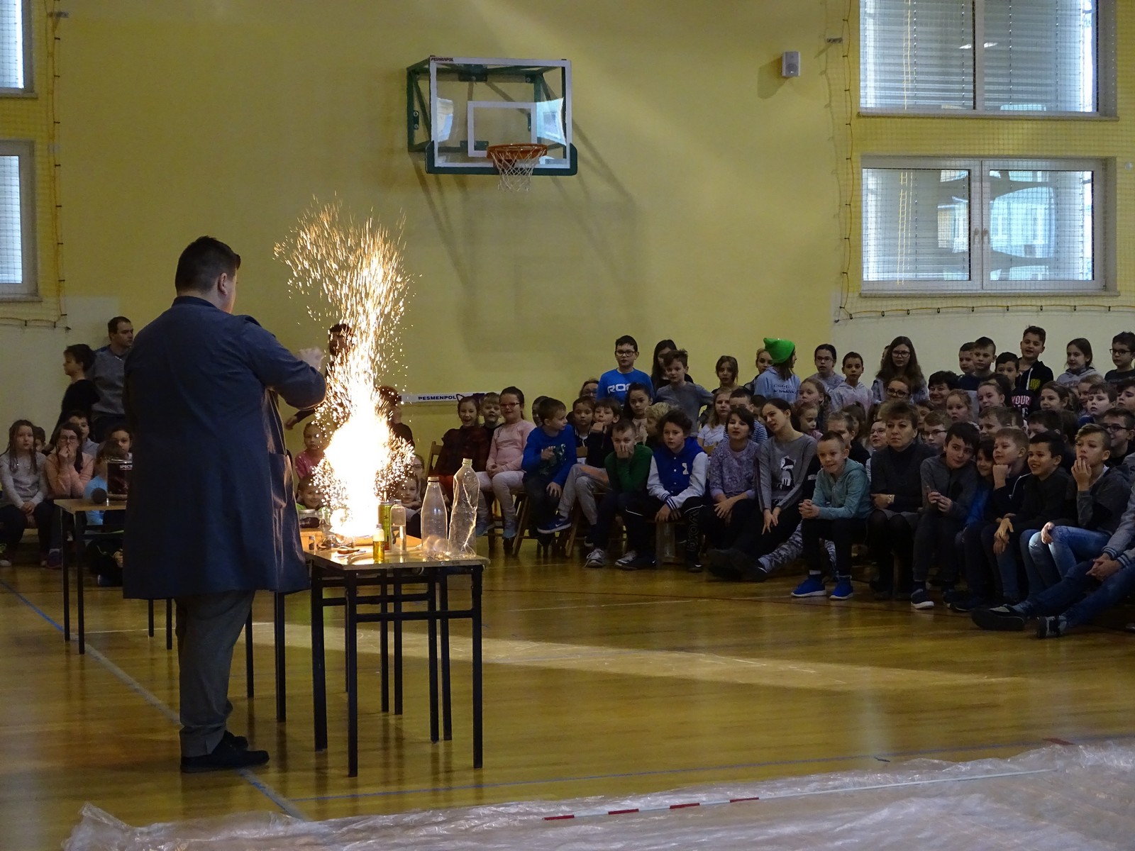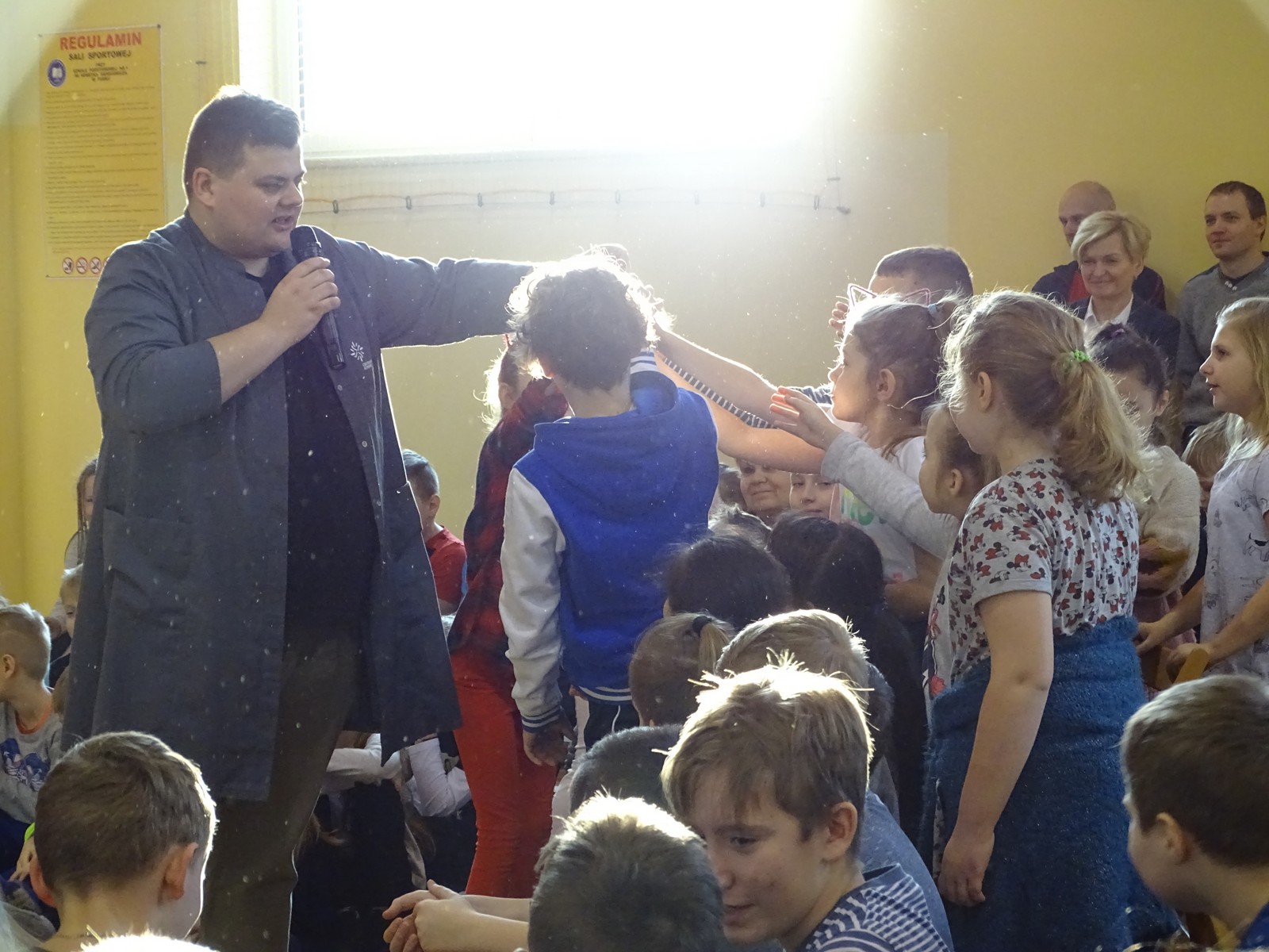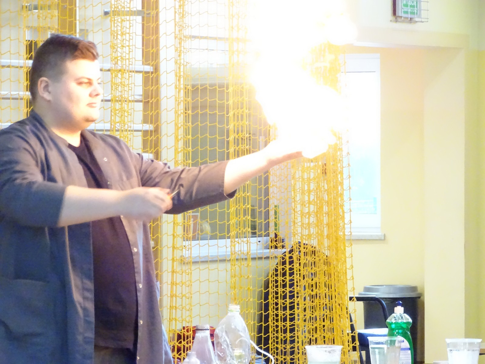 Pan Piotr na początku przybliżył uczniom podstawowe wiadomości z chemii. Później przystąpił do pokazu niesamowitych doświadczeń. Widownia była zaskoczona tym, co zobaczyła. Młody chemik zaprezentował uczniom nieskomplikowane, a zarazem ciekawe badania, które wszystkim bardzo się spodobały i zostały nagrodzony głośnymi owacjami.