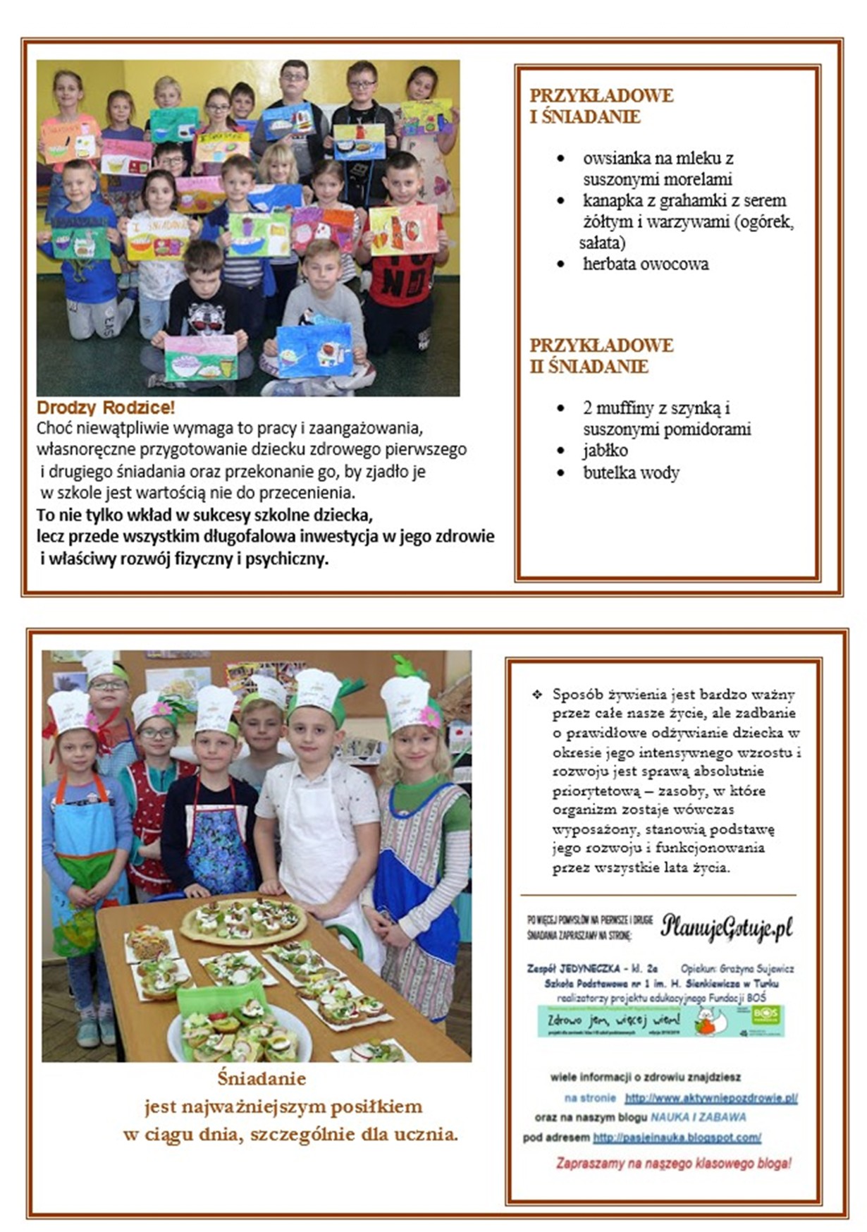 To już ostatni etap przygody uczniów klasy 2a z ogólnopolskim projektem prozdrowotnym Zdrowo jem, więcej wiem, Fundacji BOŚ. Przewodnim zagadnieniem etapu wiosennego jest znaczenie I i II śniadania dla właściwego rozwoju dziecka w myśl hasła BEZ ŚNIADANIA NIE MA NAUCZANIA. Śniadanie to najważniejszy posiłek w ciągu dnia, a także pierwszy posiłek po najdłuższym okresie odpoczynku w ciągu doby, stąd konieczne jestdostarczenie energii oraz niezbędnych składników odżywczych, aby przygotować cały organizm,a zwłaszcza mózg, do ciężkiej pracy, jaką jest nauka. Należy więc konsekwentnie stosować zasadę,że dzieci nie wychodzą rano z domu bez zjedzenia śniadania, a do szkoły zabierają przygotowane drugie śniadanie.