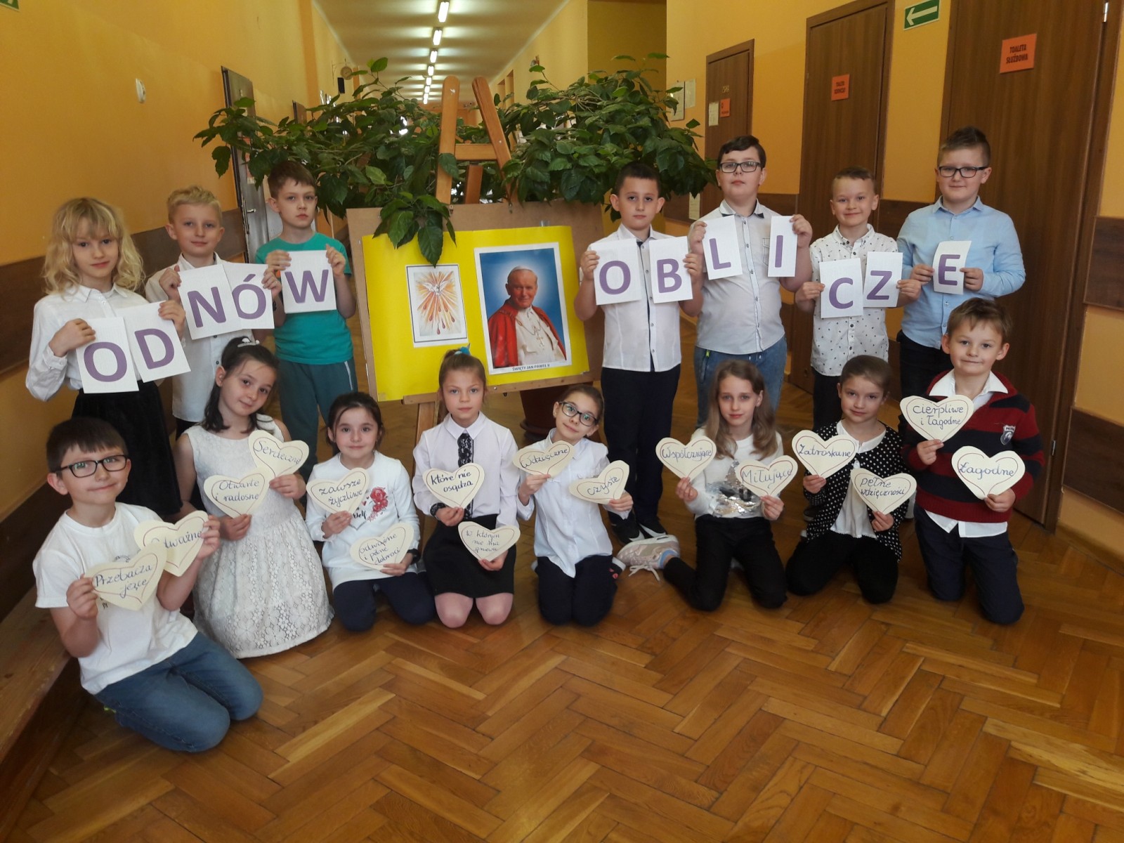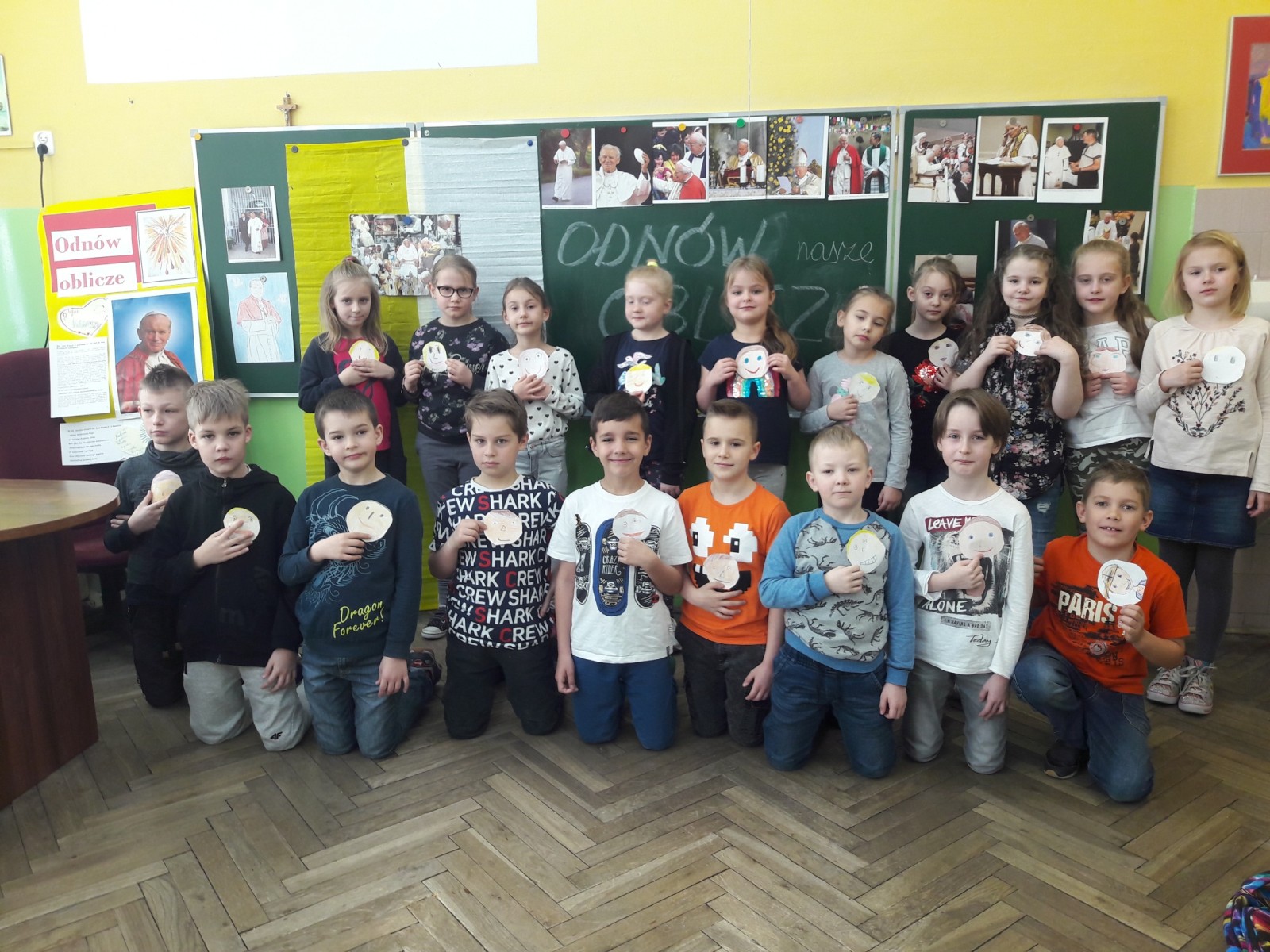 Z okazji 14 rocznicy odejścia do domu Ojca, naszego kochanego papieża – św. Jana Pawła II. , dzieci z klas 2 w czasie szkolnej katechezy - dziękowały i modliły się, w myśl hasła „ODNÓW OBLICZE” . To Miłość sprawia, że mamy łagodne spojrzenie, serdeczne i miłosierne. Jak zawsze i dzisiaj, potrzeba nam się starać, kształtować tak własny charakter, aby być życzliwym i otwartym na potrzeby drugiego człowieka. Dzieci z wielkim zaciekawieniem obejrzały fragment filmu, nagrany podczas spotkania papieża Jana Pawła II z dziećmi. Wykonane pamiątkowe zdjęcia niech przypominają nam, że życie na tej ziemi przemija, jak wspomniał to w Wadowicach Papież, cytując napis zamieszczony pod zegarem – „czas ucieka, wieczność czeka”. Warto zadbać, aby to co niezniszczalne w nas, trwało i ubogacało ludzkie życie.