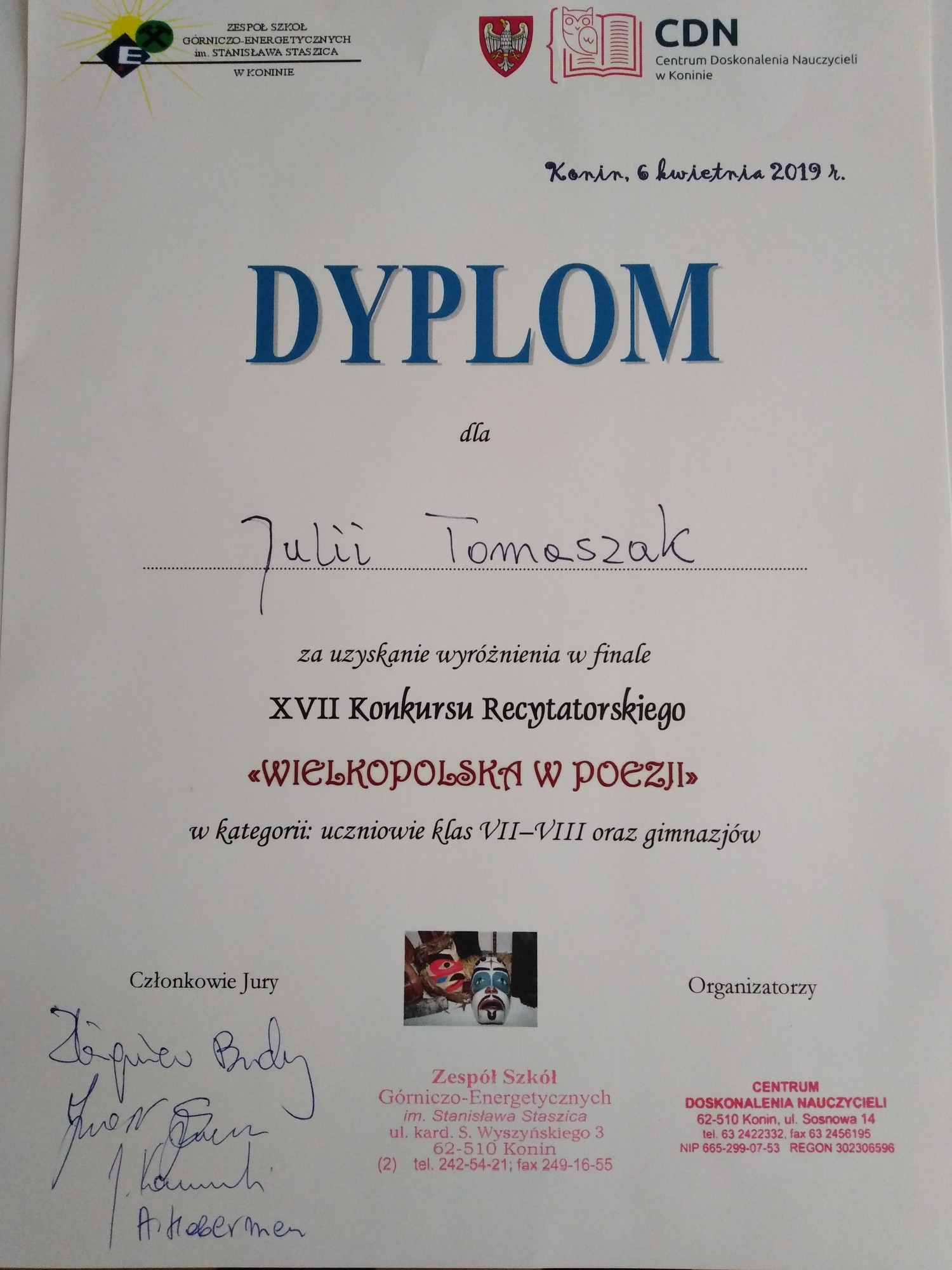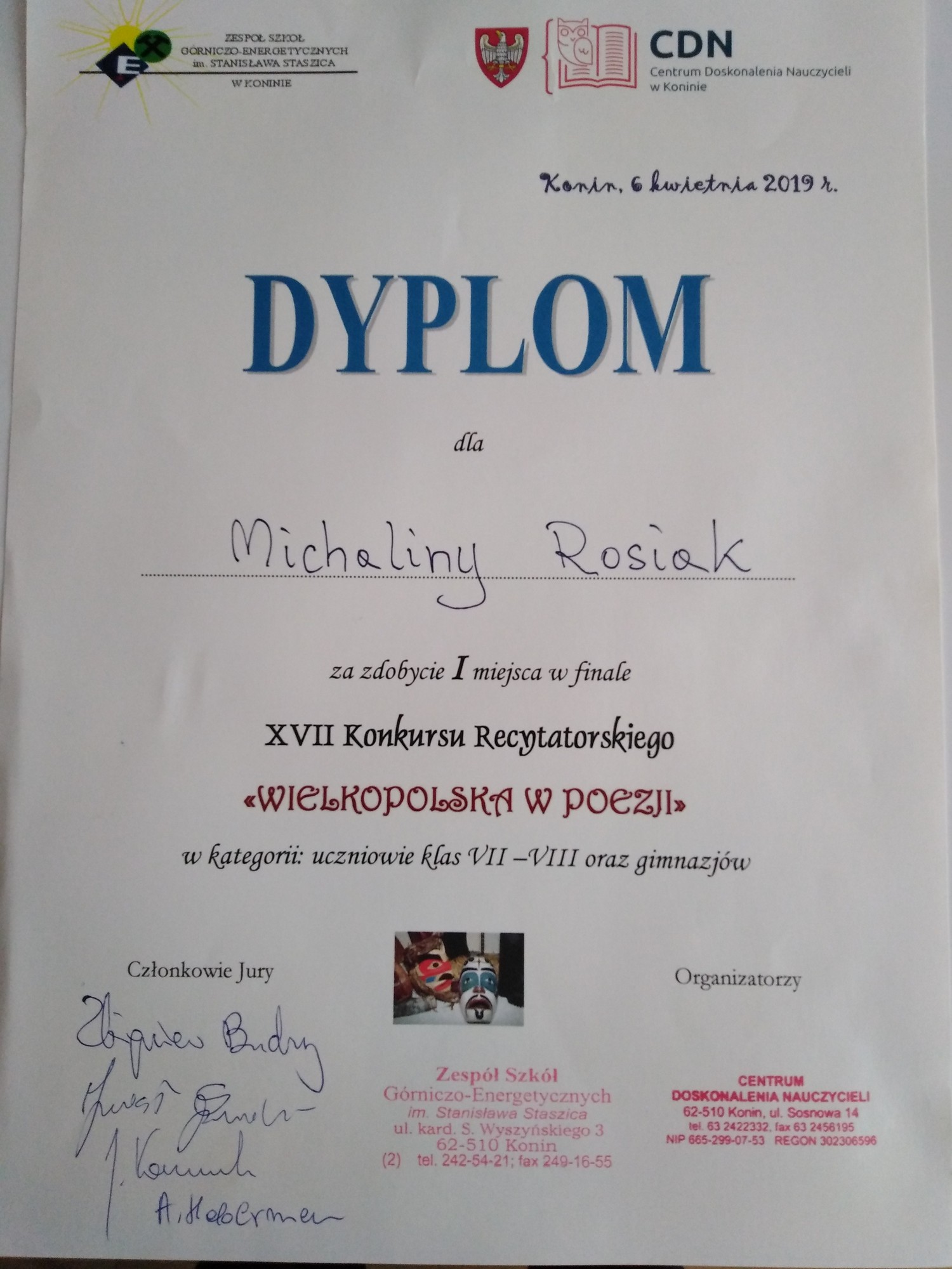 Jury pod przewodnictwem Jarosława Sparażyńskiego z Młodzieżowego Domu Kultury w Koninie przyznało 1. nagrodę w kategorii klas VII - VIII i gimnazjów uczennicy klasy 8d Michalinie Rosiak za niezwykłą interpretację wiersza Eli Galoch "Rozstanie". Wyróżnienie otrzymała Julia Tomaszak (kl. 3b Gim.) Na pochwałę zasługują także prezentacje w wykonaniu Agaty Drabiny (kl.3bGim.), Aleksandry Pietrzak i Niny Grabary (kl. 8d)