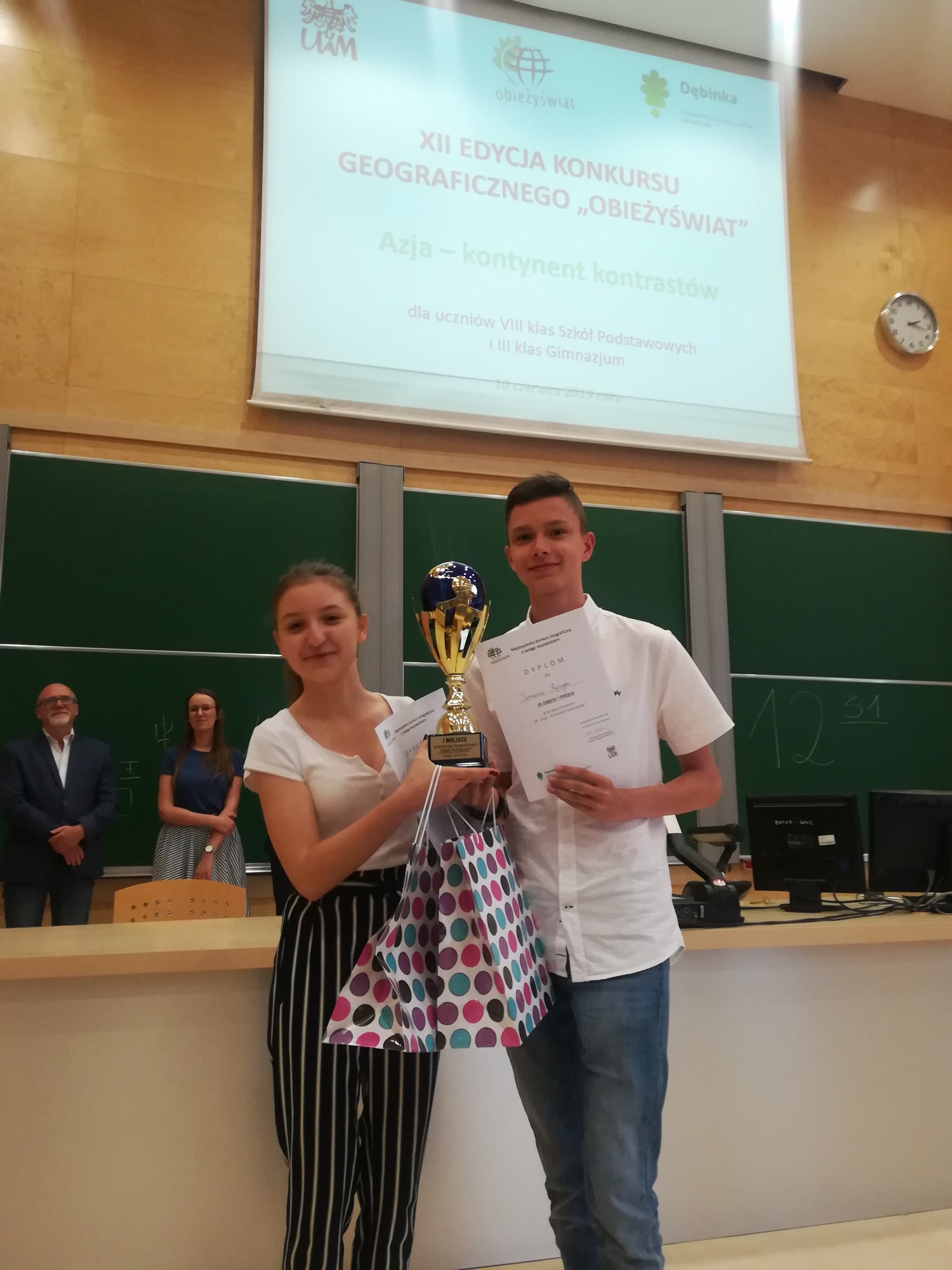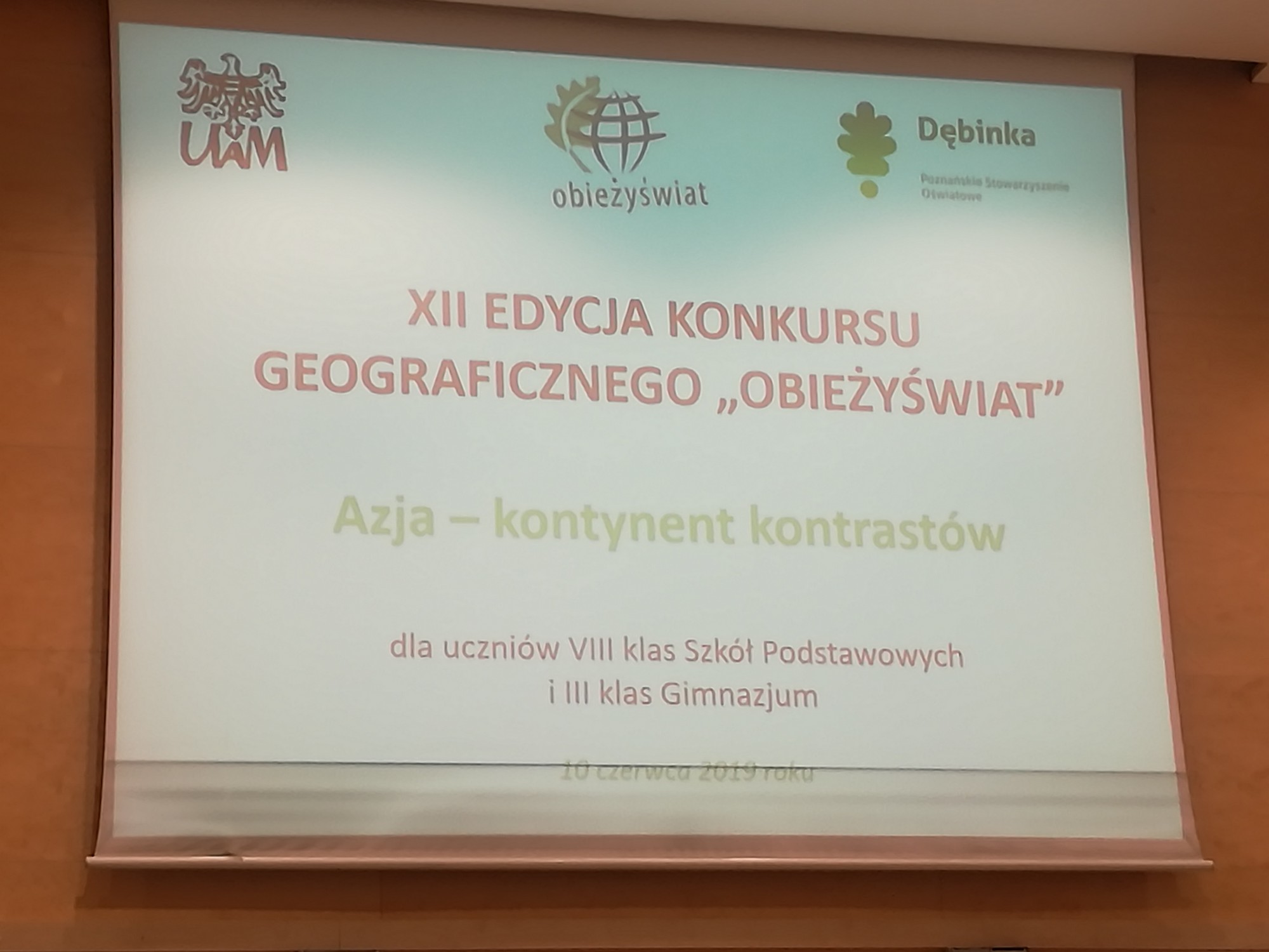 Dnia 10 czerwca 2019 r. uczniowie klasy 8 naszej szkoły Natalia Kałużna i Tomasz Rajczyk oraz gimnazjalistki Zuzanna Szczesiak i Alicja Rybka pod opieką Małgorzaty Kaczkowskiej wzięły udział w XII finale Międzyszkolnego Konkursu Geograficznego OBIEŻYŚWIAT pod tytułem "Azja - kontynent kontrastów".