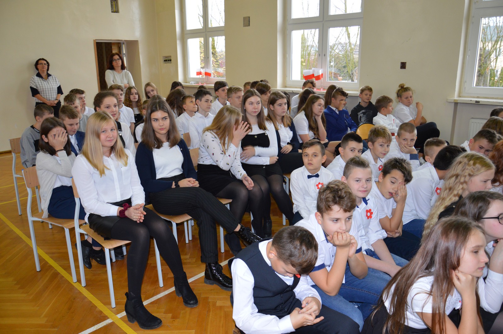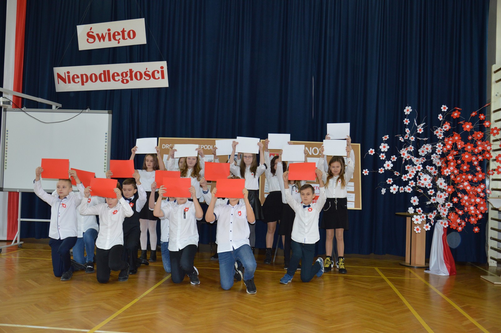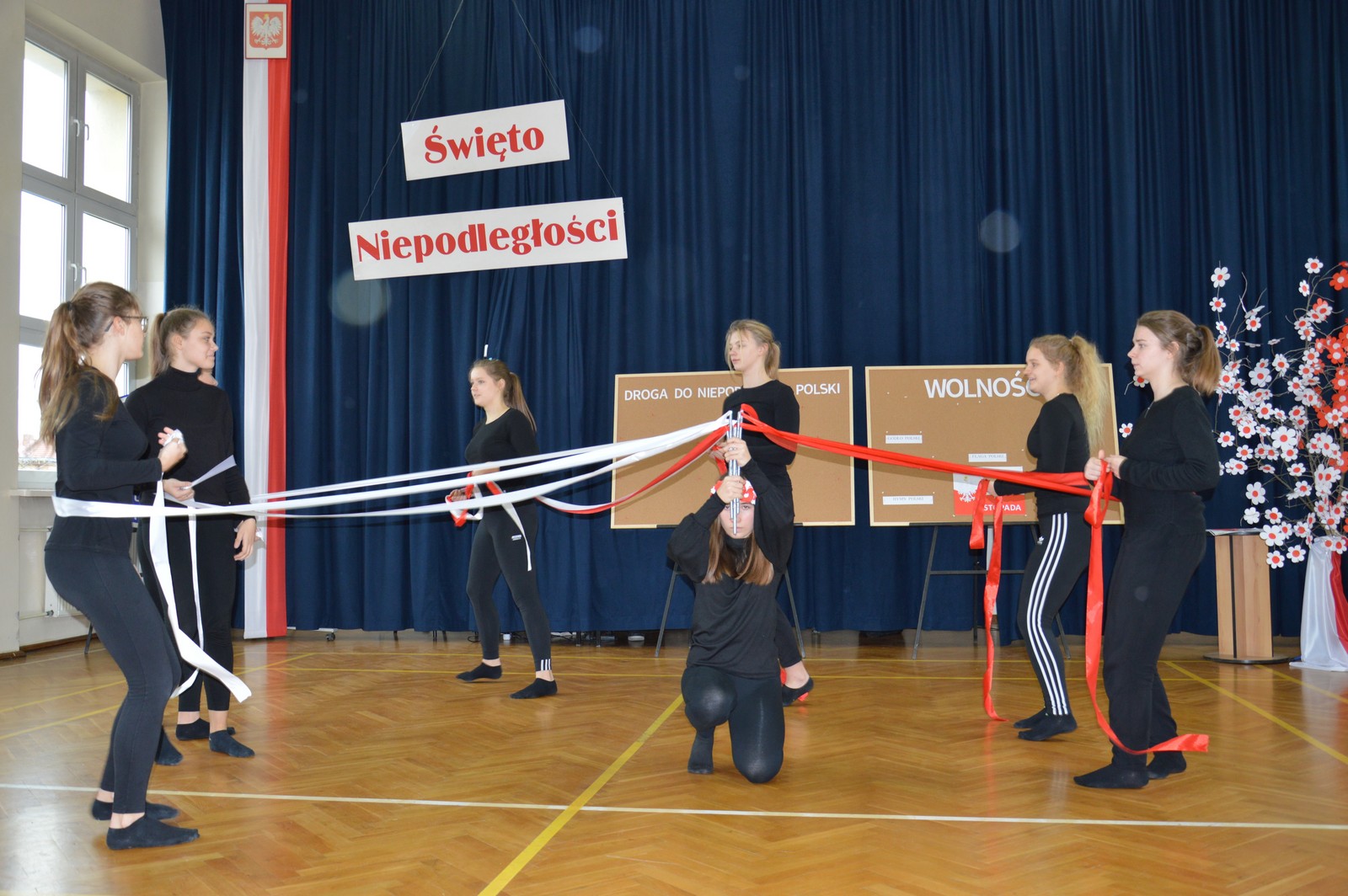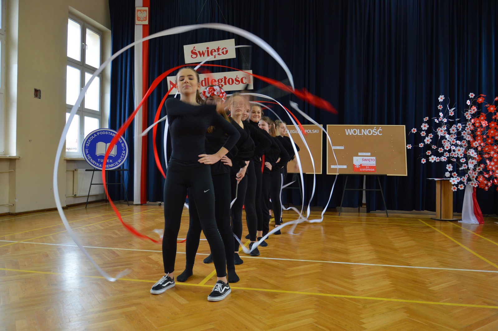 i przygotowane na tę okoliczność „drzewko niepodległościowe” ozdobiły nasz korytarz szkolny. Następnie obejrzano film pt.: „Co to jest niepodległość”, przy wtórze piosenki o tym samym tytule. Kolejna pieśń „Jest takie miejsce” wzbudziła silne emocje i potwierdziła, jak bardzo związani jesteśmy z naszą ojczyzną. Polski taniec narodowy – polonez, w wykonaniu klasy V d, zakończył naszą uroczystość. Dziękujemy wszystkim uczniom za chwile pełne wzruszeń.