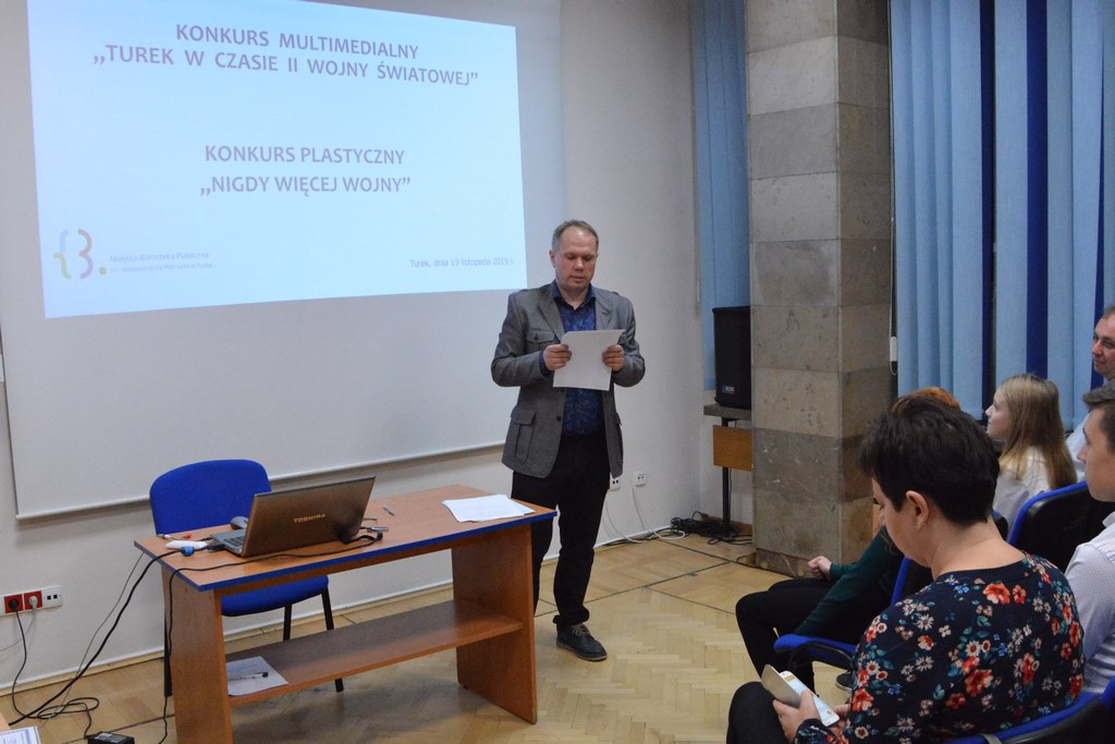 We wtorkowe popołudnie 19.11.2019r. w siedzibie Miejskiej Biblioteki Publicznej w Turku odbyło się rozstrzygnięcie dwóch konkursów połączone ze spotkaniem dla uczestników Programu 50+. Pierwszy z nich dotyczył wykonania prezentacji multimedialnej pod hasłem: „Turek w czasie II wojny światowej”, a drugi konkurs - wykonania pracy plastycznej w formie plakatu pod hasłem „Nigdy więcej wojny”. Komisja Konkursowa w składzie: Bartosz Stachowiak - Dyrektor Muzeum Miasta Turku, Małgorzata Pawłowska – pracownik Czytelni Książek, Czasopism i Zbiorów Regionalnych oraz Marcin Michalak – pracownik Pracowni Komputerowej i Wypożyczalni Zbiorów Multimedialnych, postanowiło przyznać 3 nagrody. Pierwsze miejsce zajęła prezentacja multimedialna Mikołaja Kacprzaka i Szymona Kurzawy, uczniów kl. VIIId Szkoły Podstawowej nr 1 w Turku, drugie miejsce zajęły uczennice kl. VI d Szkoły Podstawowej nr 1 – Lena Gradzik i Gabriela Macudzińska. Opiekunem uczniów naszej szkoły była pani Irena Dominiak. Natomiast miejsce trzecie przypadło Martynie Kazikowskiej, uczennicy kl. VI d Szkoły Podstawowej nr 5 w Turku.