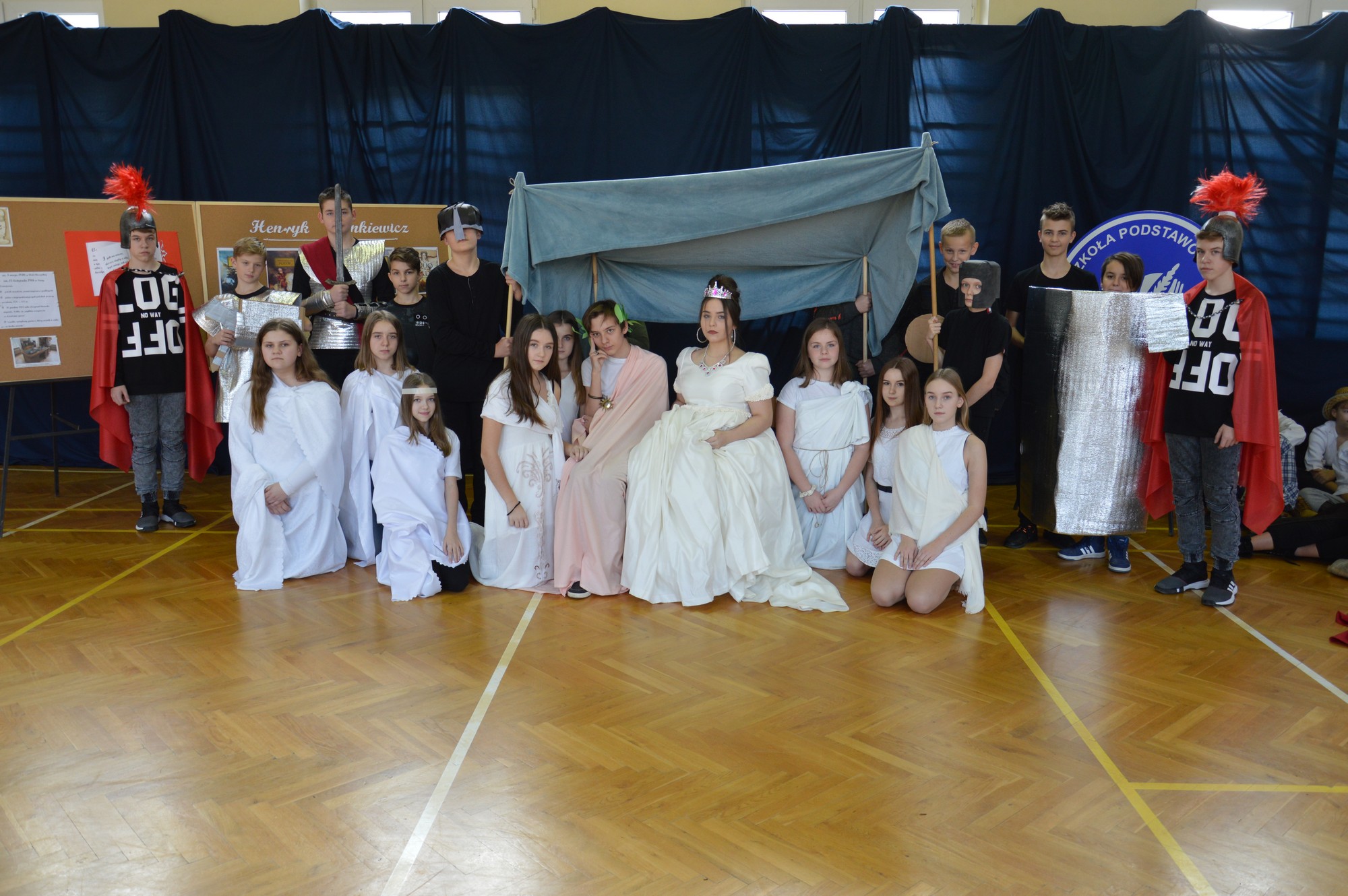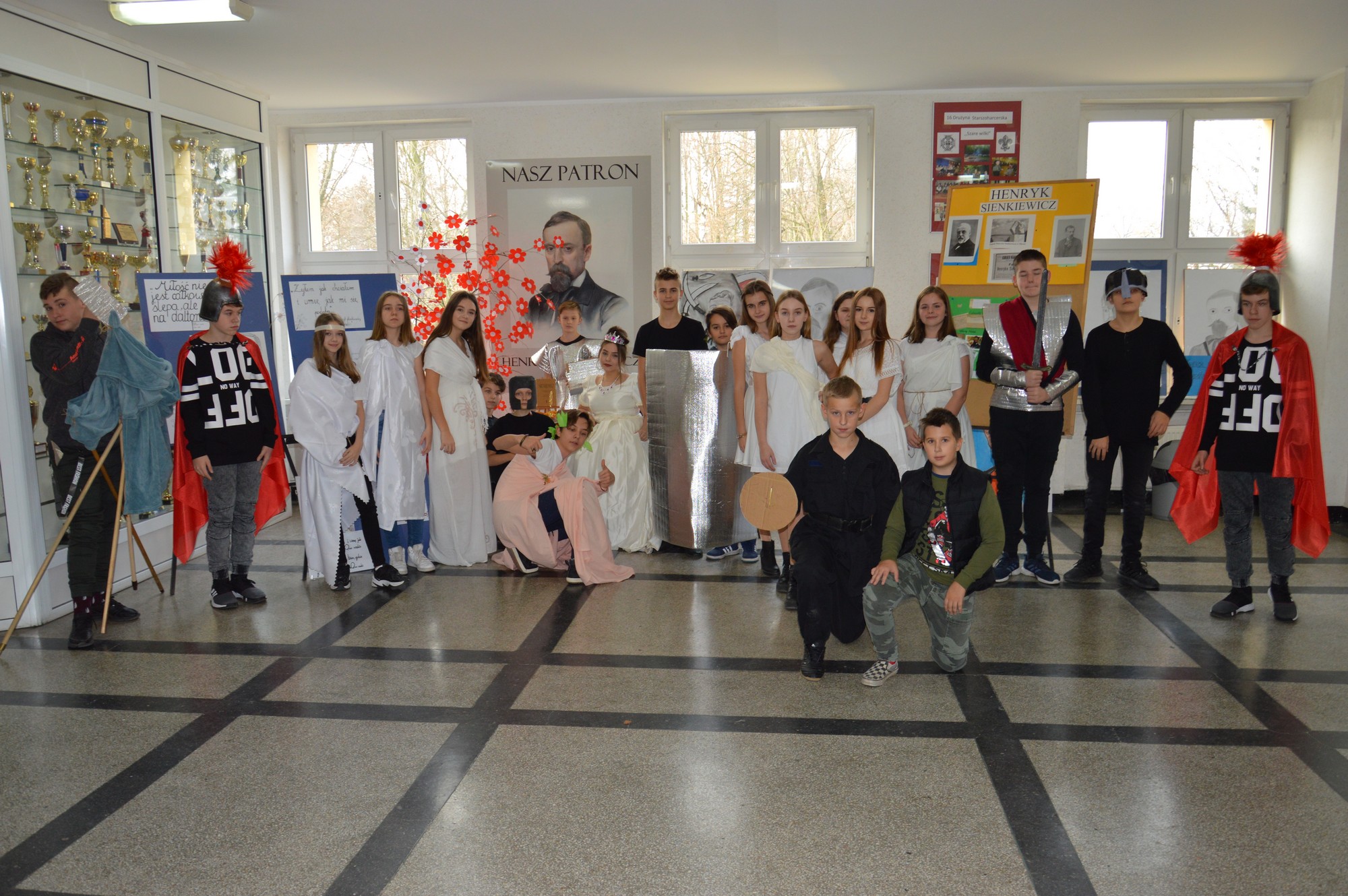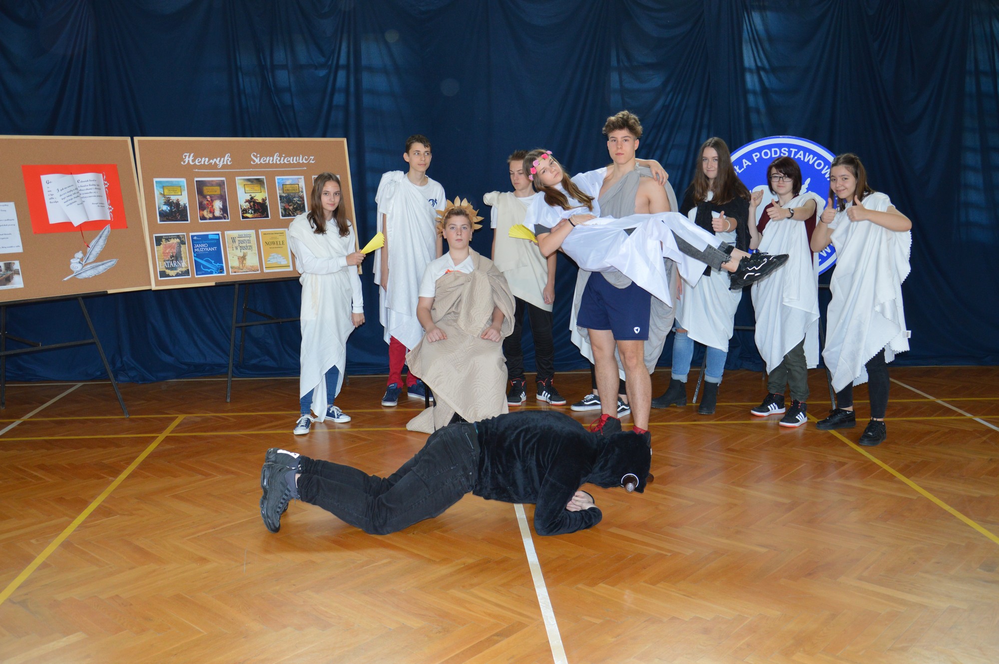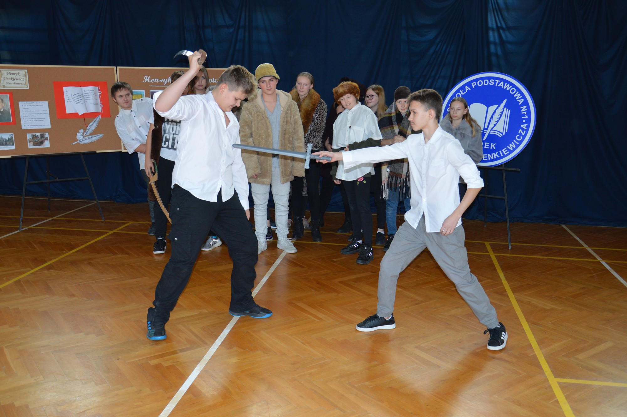 Uczniowie wcielili się w role bohaterów literackich z utworów Patrona i przenieśliśmy się w świat, jaki na łamach swych dzieł literackich stworzył Sienkiewicz. Pozostali uczniowie na sali odgadywali tytuł utworu, z którego pochodziła przedstawiana scena. Ogrom braw świadczył o tym, że wszyscy znakomicie się zaprezentowali. Wyłonienie zwycięzców nie było łatwym zadaniem.