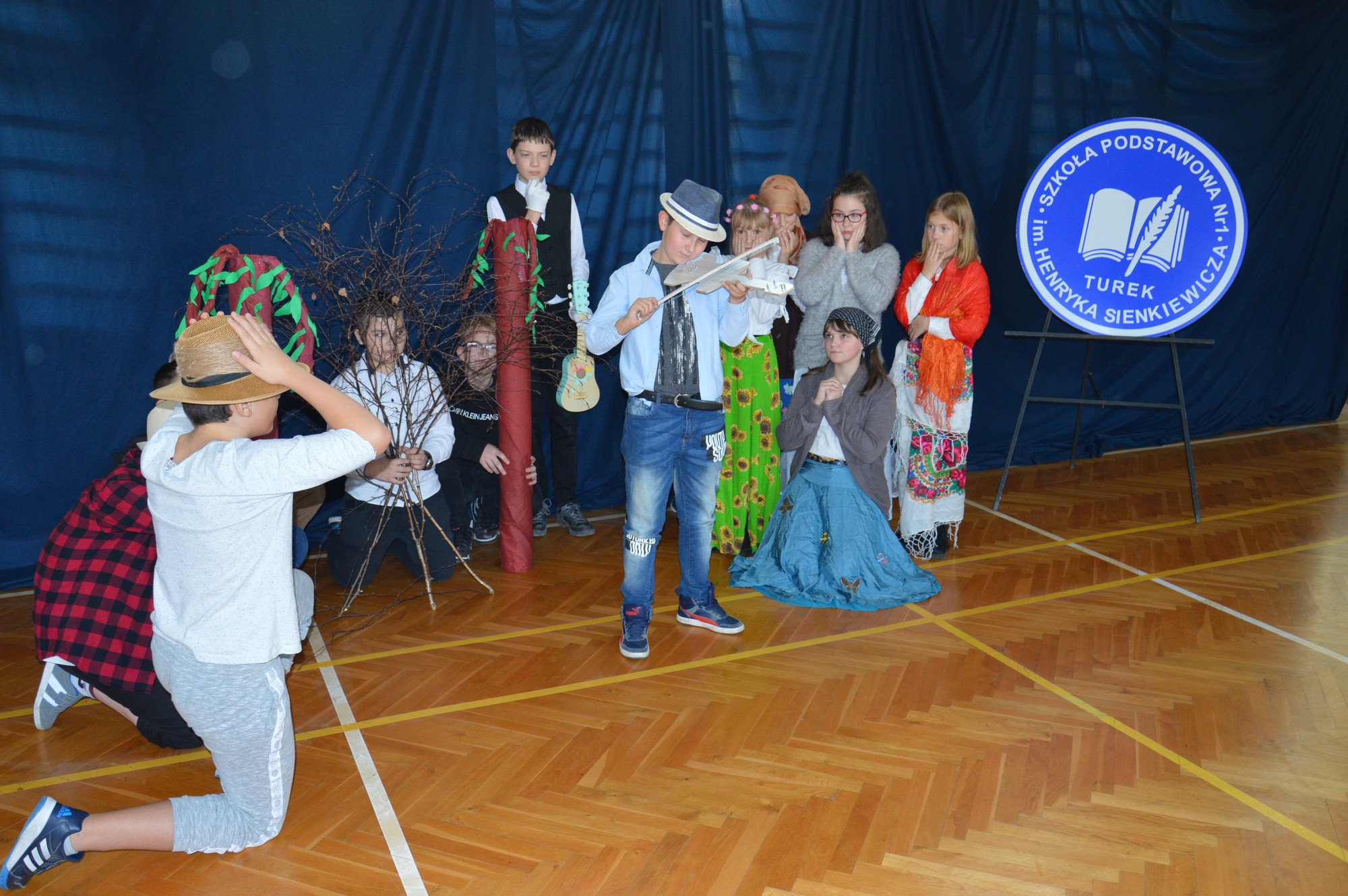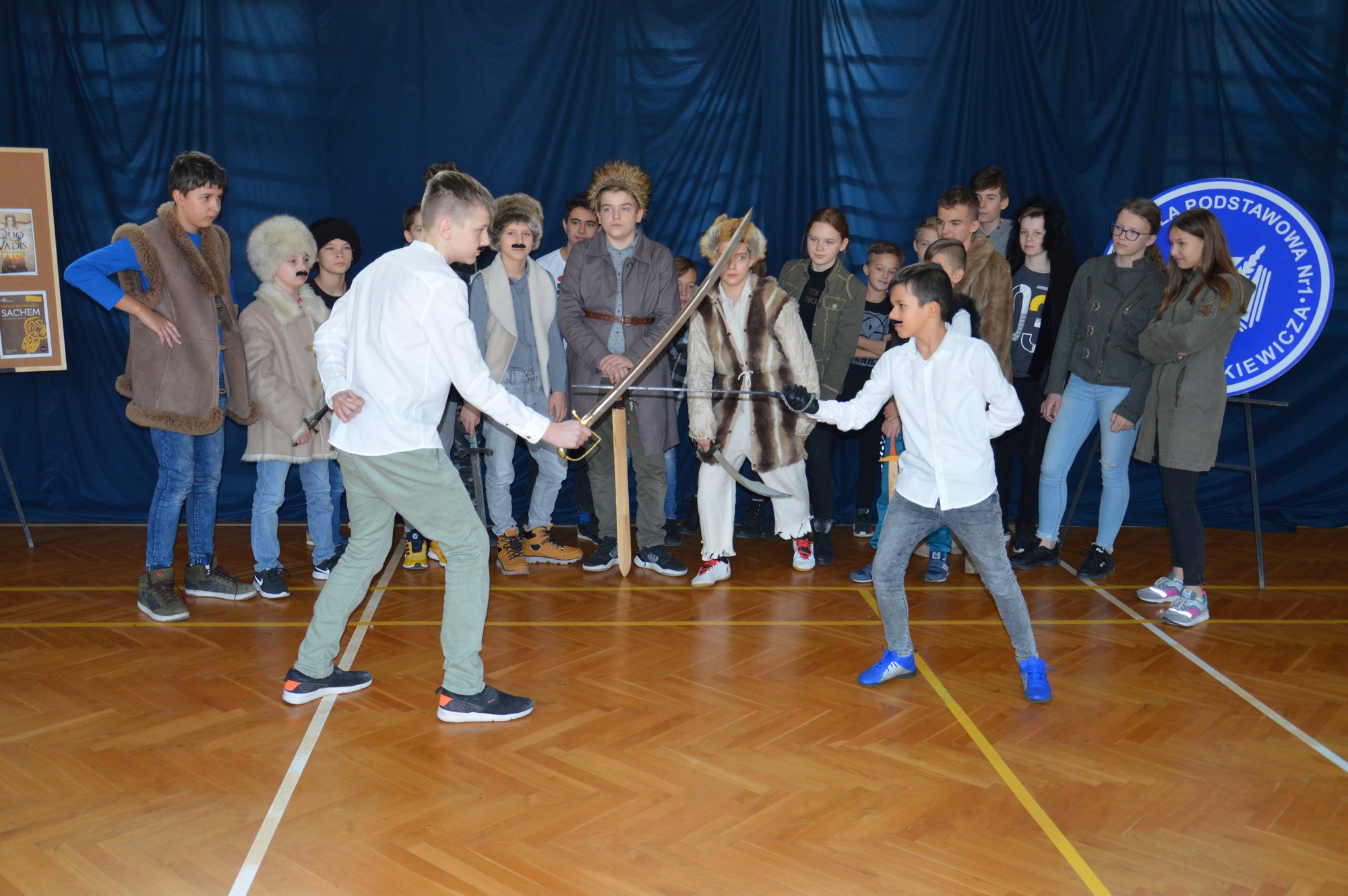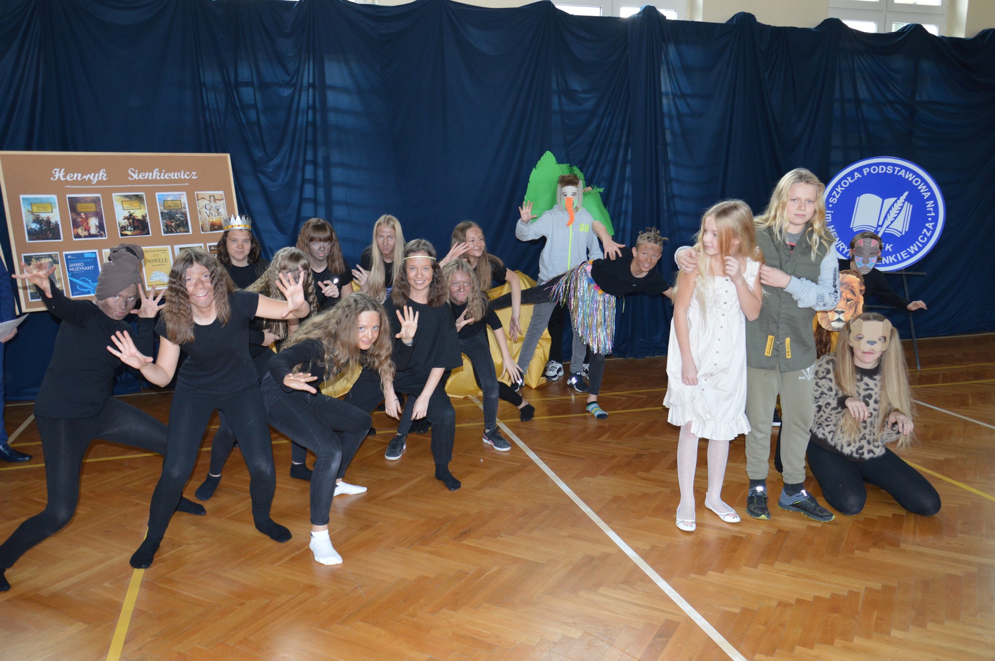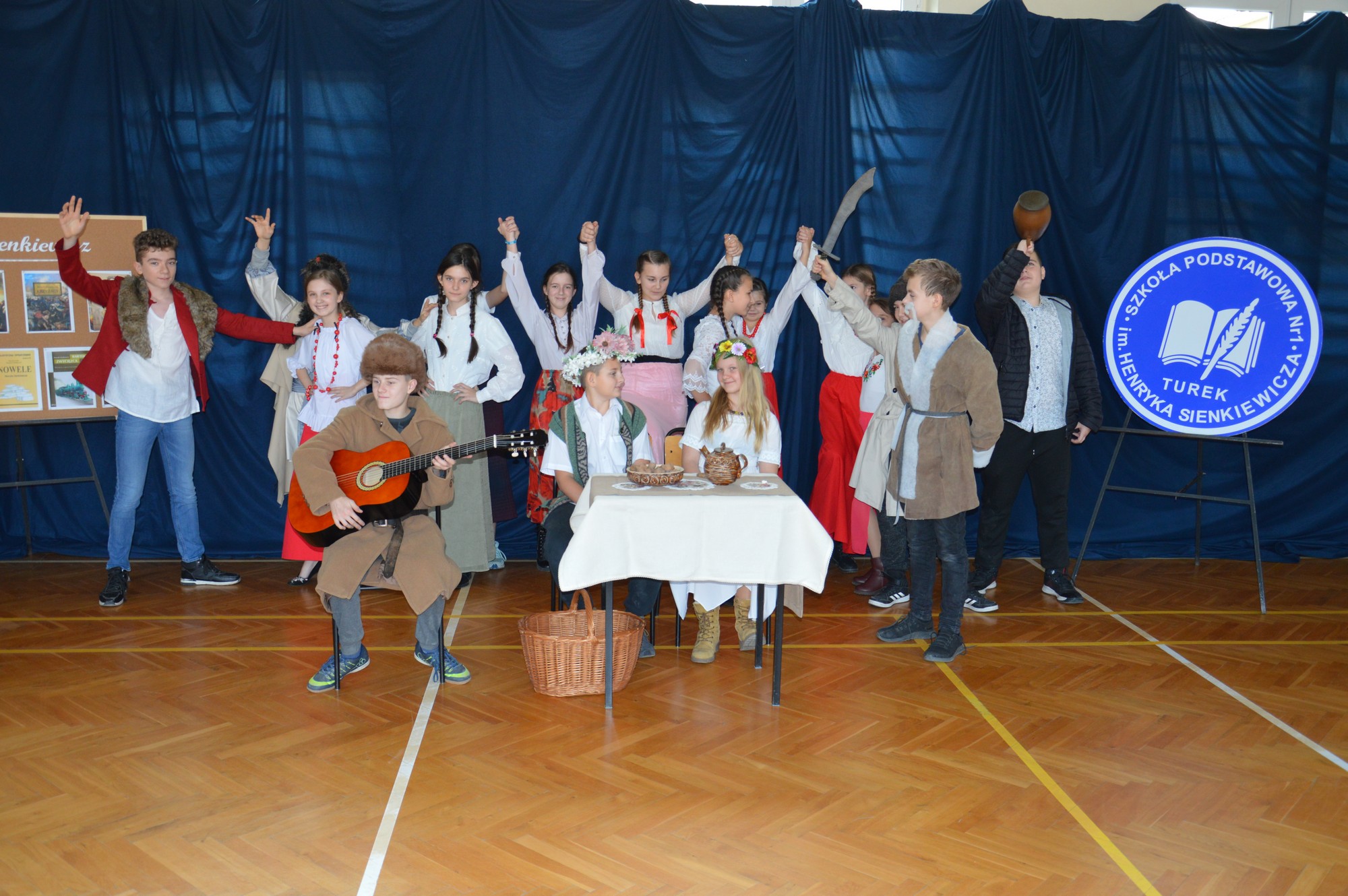 Uczniowie wcielili się w role bohaterów literackich z utworów Patrona i przenieśliśmy się w świat, jaki na łamach swych dzieł literackich stworzył Sienkiewicz. Pozostali uczniowie na sali odgadywali tytuł utworu, z którego pochodziła przedstawiana scena. Ogrom braw świadczył o tym, że wszyscy znakomicie się zaprezentowali. Wyłonienie zwycięzców nie było łatwym zadaniem.