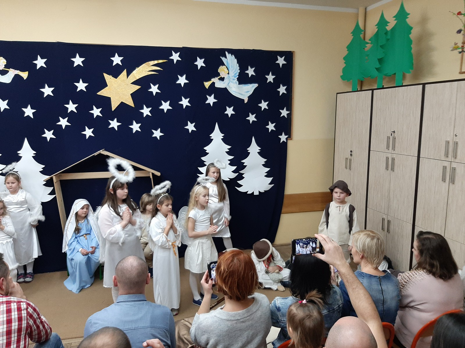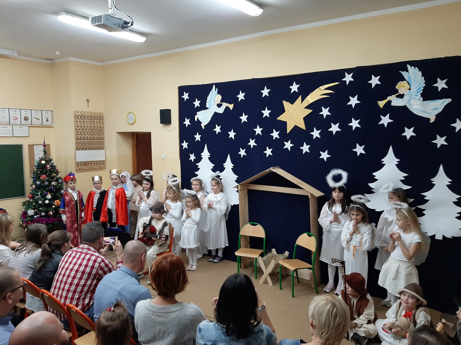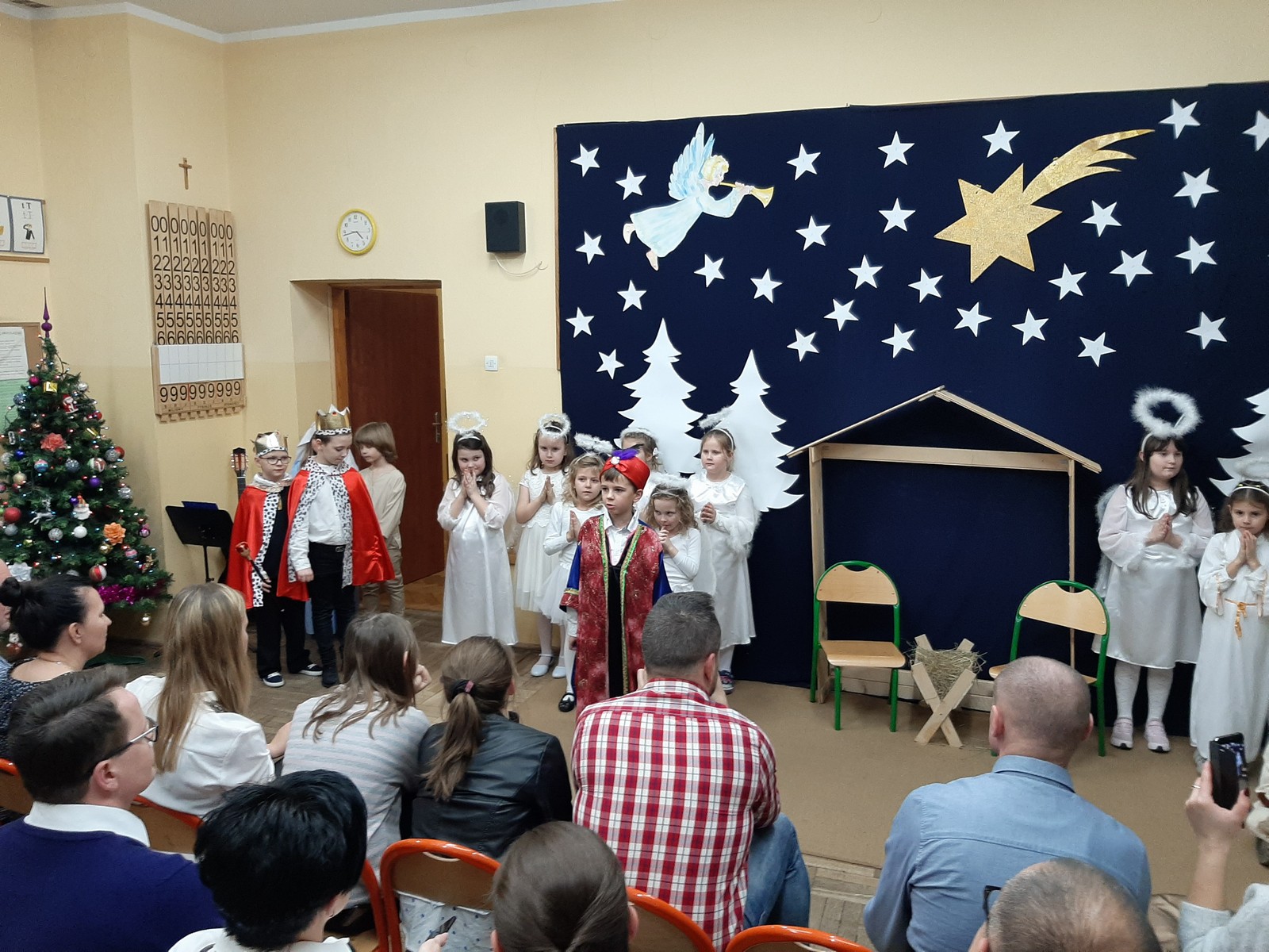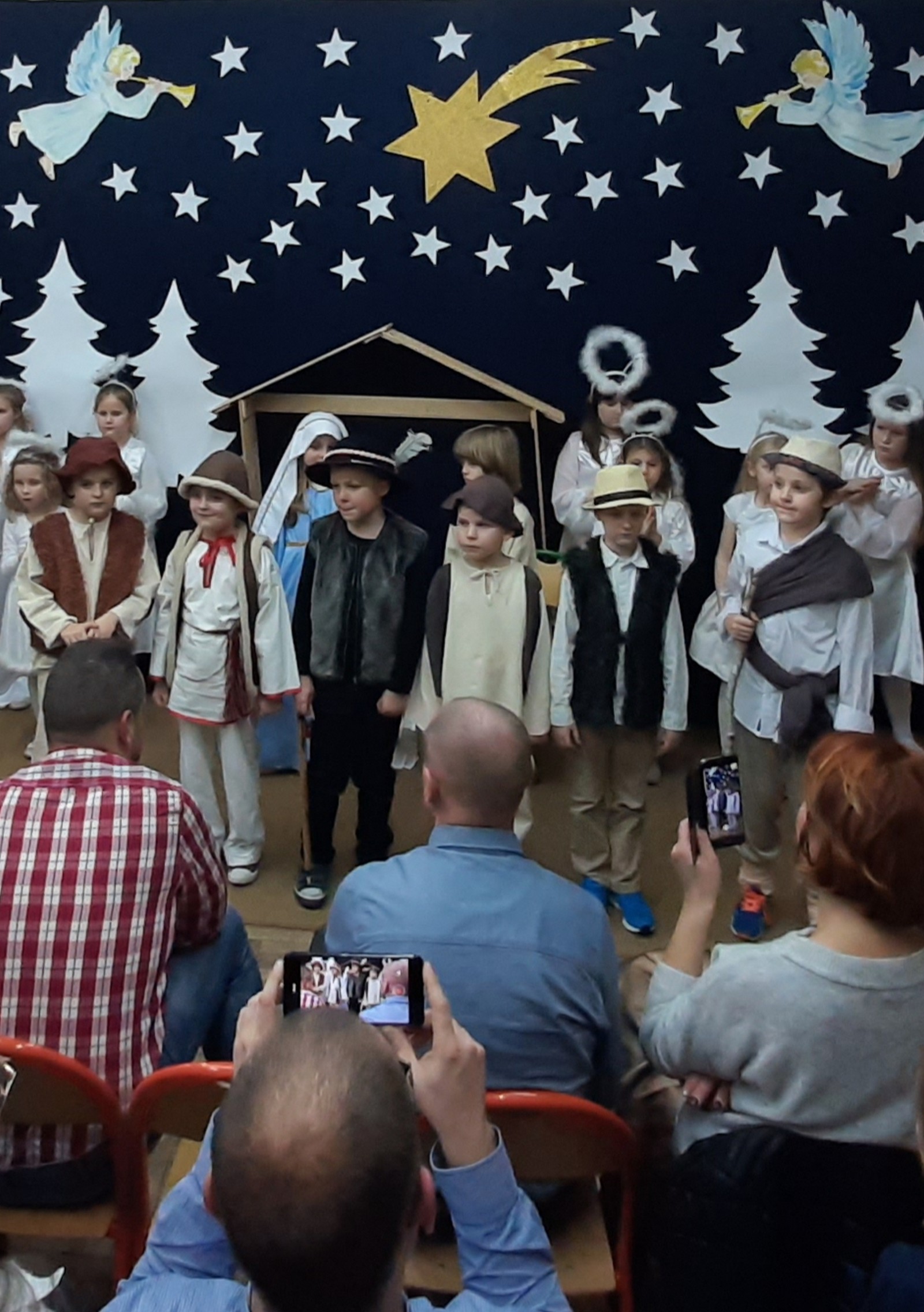 17 grudnia, w godzinach popołudniowych, uczniowie z klasy 1c z wychowawczynią p. Agnieszką Perlińską, wystawili bożonarodzeniowe jasełka PRZY BOŻYM ŻŁÓBKU SIĘ ZEBRALI. Na przedstawienie zaprosili najważniejszych widzów- rodziców. Uczniowie wcielili się w tradycyjne postaci z betlejemskiej szopki. Byli Józef i Maria, zatroskani i zmęczeni poszukiwaniem miejsca do narodzin Jezuska. Sceny wystawione w jasełkach obrazowały moment przybycia Trzech Króli, biednych pasterzy i opiekę Dzieciątka przez anioły. Dzieci zaprezentowały się w recytacji, śpiewie, tańcu i grze na instrumentach. Wzruszeni rodzice nagrodzili małych artystów gromkimi brawami oraz drobnymi prezentami i poczęstunkiem. To był nasz pierwszy klasowy występ przed publicznością!