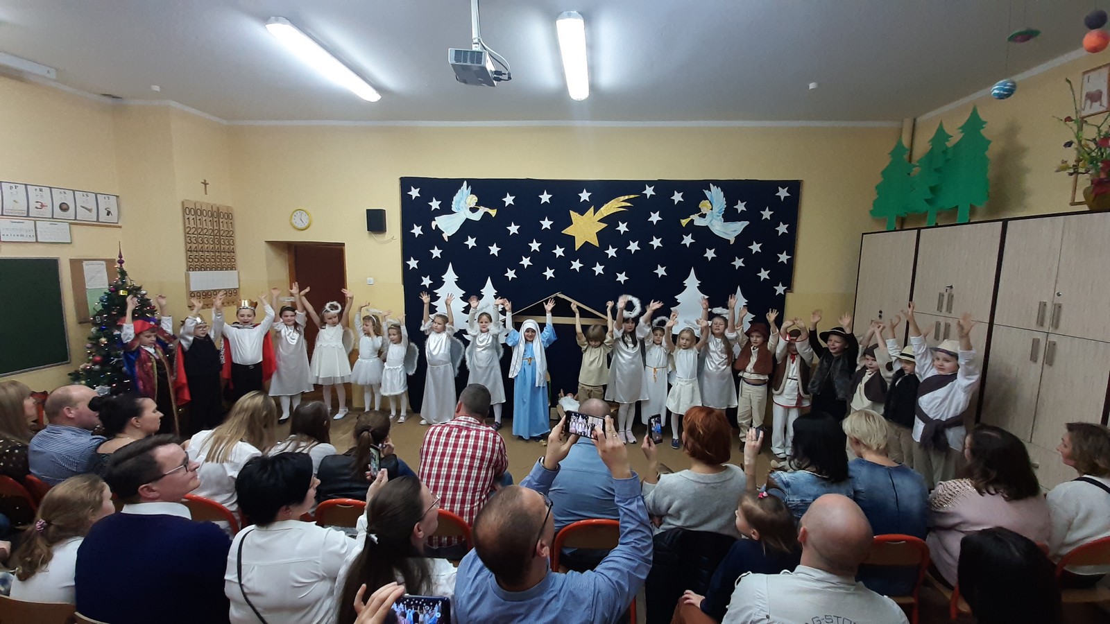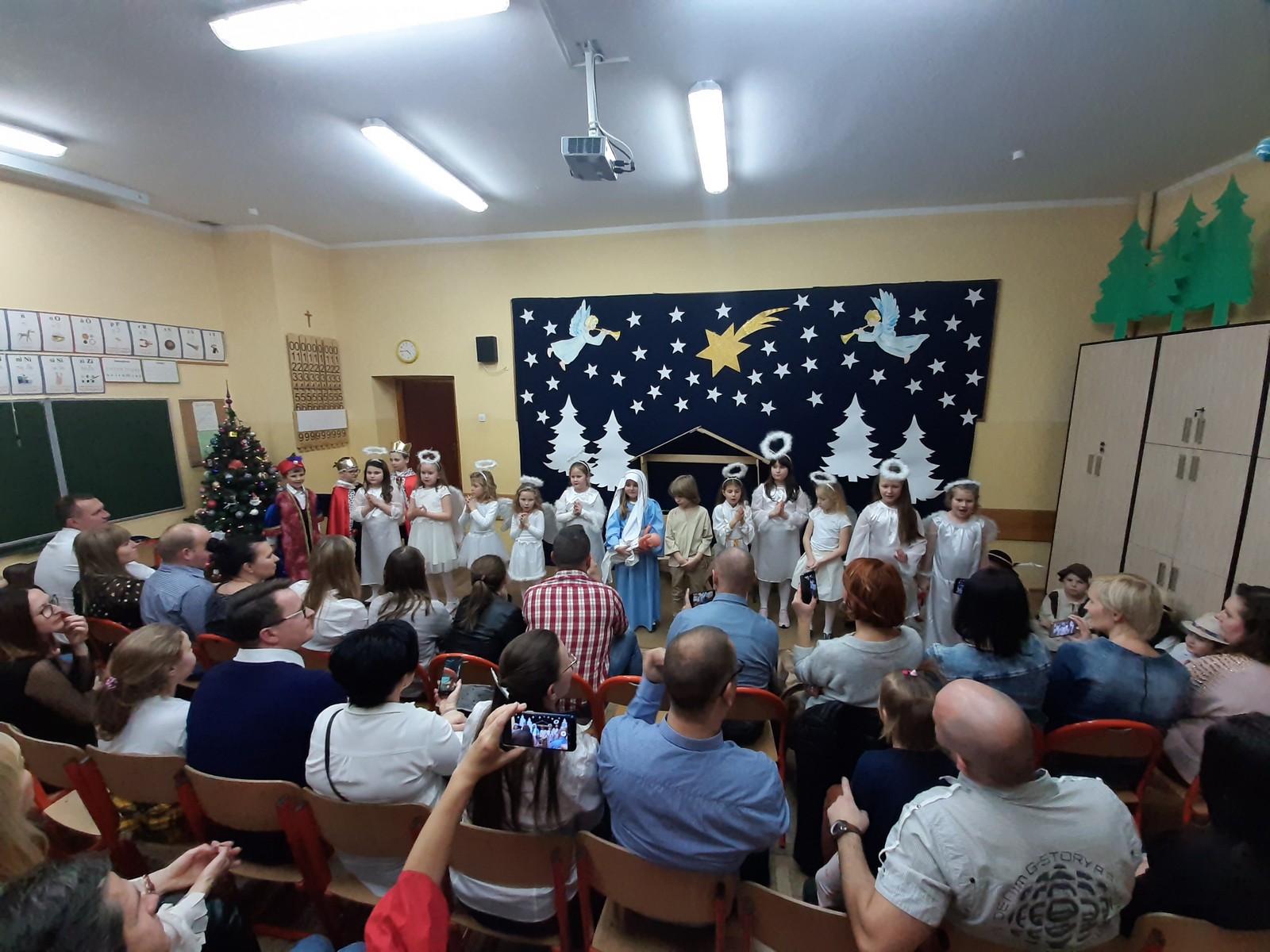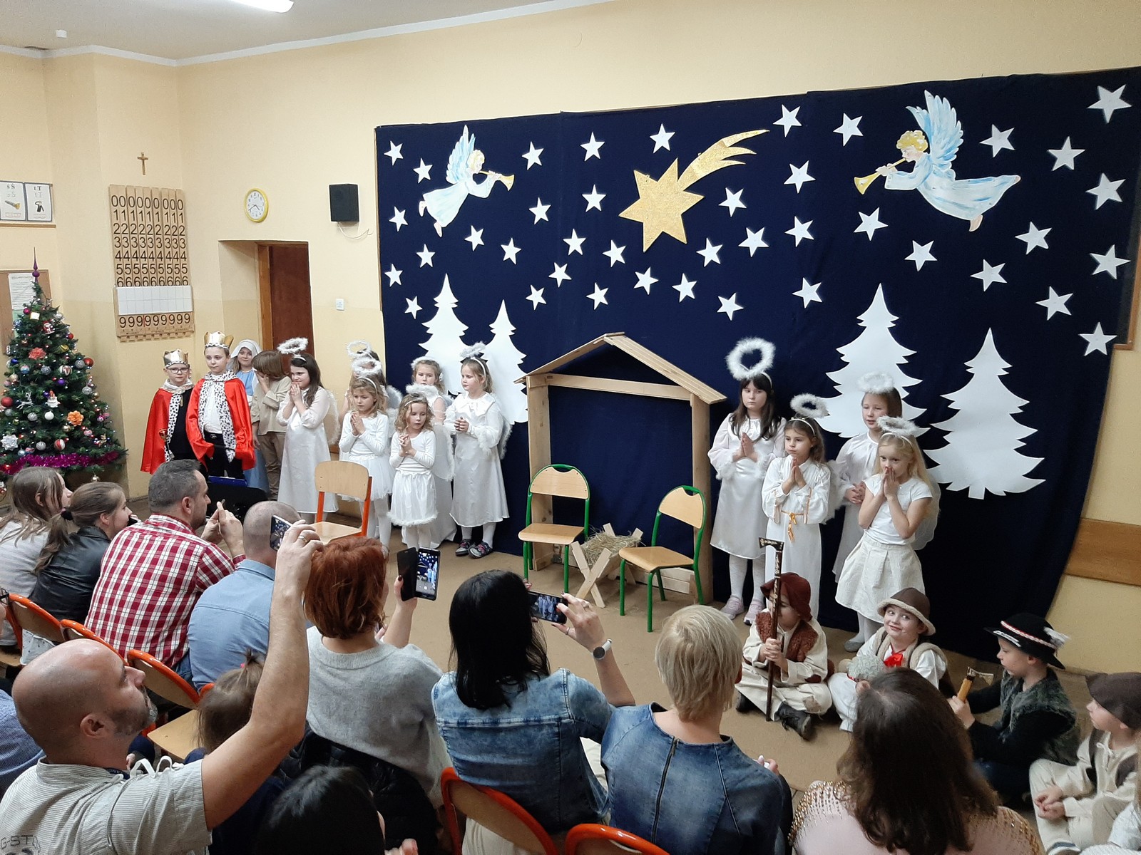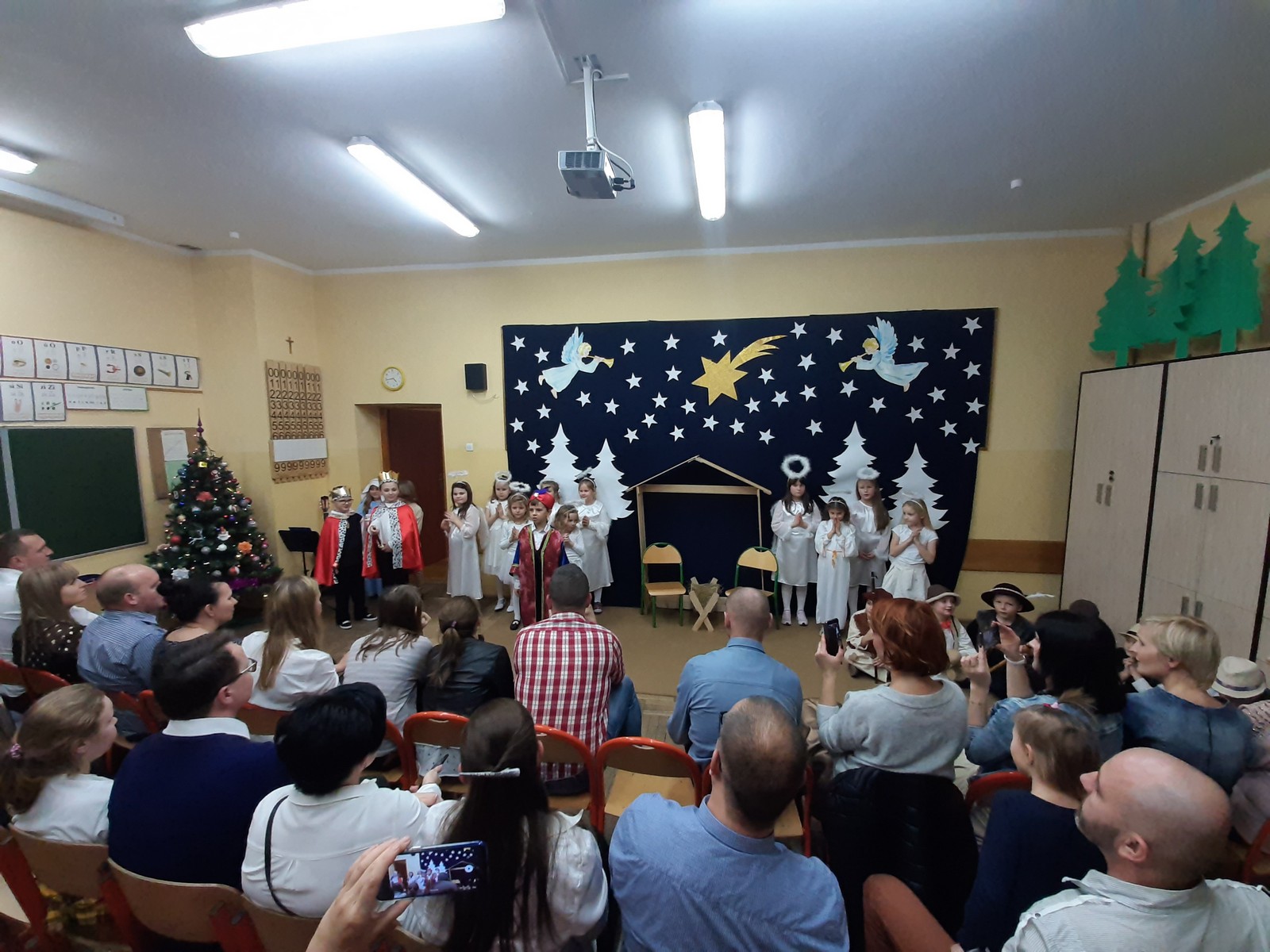 17 grudnia, w godzinach popołudniowych, uczniowie z klasy 1c z wychowawczynią p. Agnieszką Perlińską, wystawili bożonarodzeniowe jasełka PRZY BOŻYM ŻŁÓBKU SIĘ ZEBRALI. Na przedstawienie zaprosili najważniejszych widzów- rodziców. Uczniowie wcielili się w tradycyjne postaci z betlejemskiej szopki. Byli Józef i Maria, zatroskani i zmęczeni poszukiwaniem miejsca do narodzin Jezuska. Sceny wystawione w jasełkach obrazowały moment przybycia Trzech Króli, biednych pasterzy i opiekę Dzieciątka przez anioły. Dzieci zaprezentowały się w recytacji, śpiewie, tańcu i grze na instrumentach. Wzruszeni rodzice nagrodzili małych artystów gromkimi brawami oraz drobnymi prezentami i poczęstunkiem. To był nasz pierwszy klasowy występ przed publicznością!