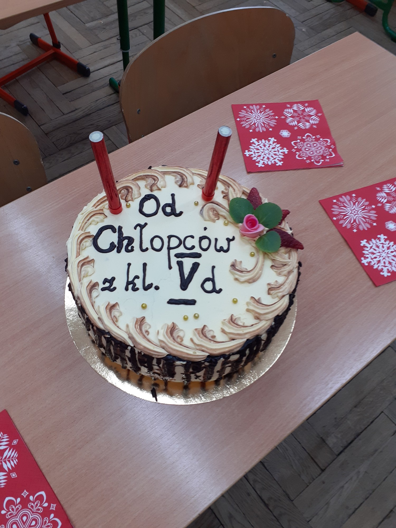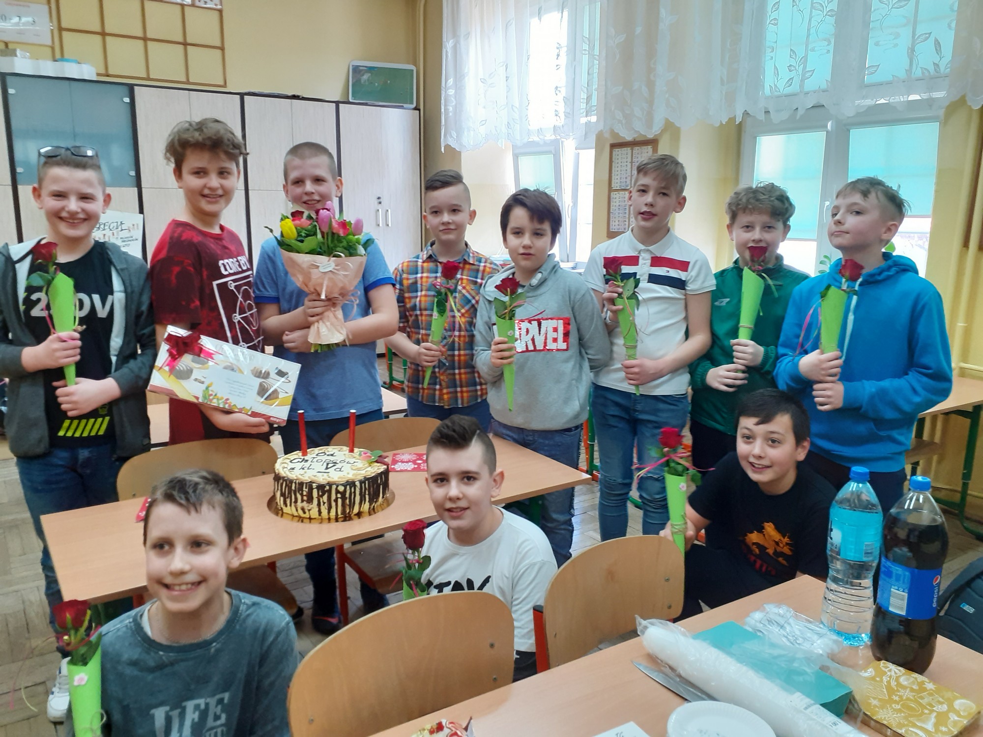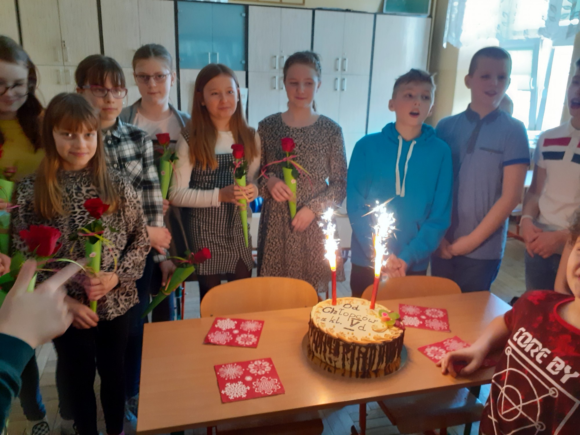 W dzisiejszym dniu w klasie 5D obchodziliśmy Dzień Kobiet. Prezentem był wspaniały tort, życzenia oraz symboliczna róża dla wszystkich dziewczynek . Impreza zorganizowana przez chłopców była bardzo udana.