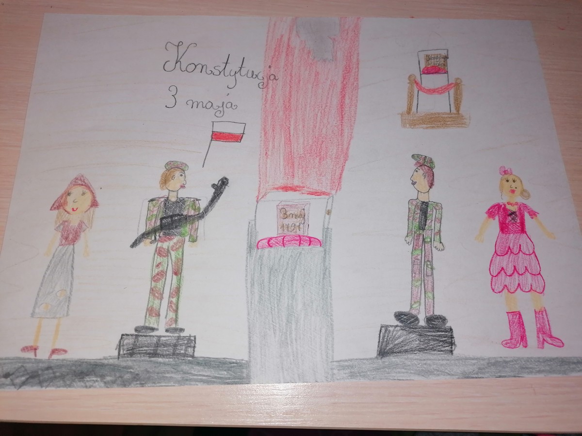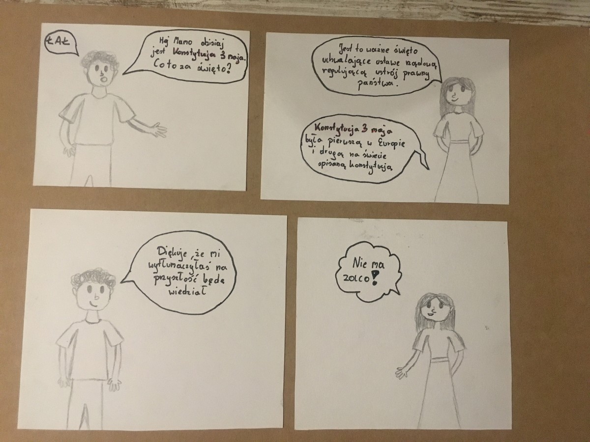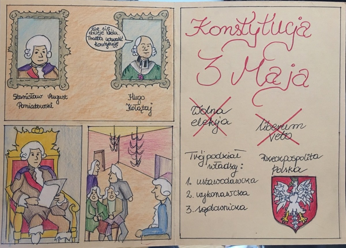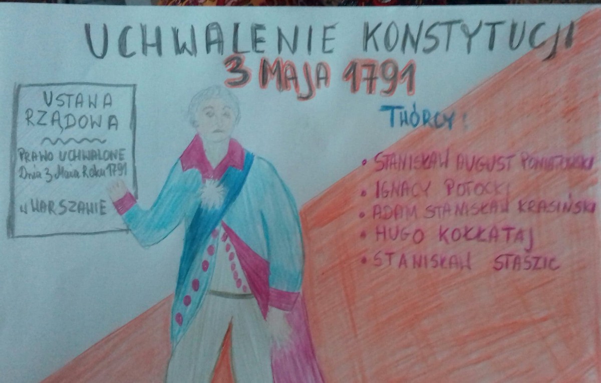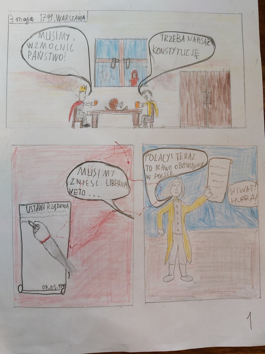 W tym roku uczniowie Szkoły Podstawowej nr 1 im. Henryka Sienkiewicza nie mogli obchodzić tego święta tak, jak to bywało w latach ubiegłych. Uroczyste apele, wystawy, wspólne śpiewanie pieśni patriotycznych nie były możliwe do zrealizowania. Ale to nie oznacza, że można było pominąć ten ważny w kalendarzu imprez szkolnych dzień. Uczniowie „Jedynki” z tej okazji przygotowali komiksy. Każdy zawierał ciekawostki na temat obchodzonego święta lub pomysły na świętowanie w dobie pandemii koronawirusa. Pomysłowość uczniów nie miała granic. Twórcy komiksów zaprezentowali m. in. pomysł zorganizowania wirtualnego koncertu, wirtualnego biegu z okazji Święta Konstytucji 3 Maja czy utworzenie zespołu muzycznego „Konstytucja”, którego członkowie to Konsty i Tucja. Młodsi uczniowie wzięli udział w wirtualnej lekcji historii na Zamku Królewskim w Warszawie, a następnie przystąpili do zilustrowania tego ważnego dla państwa polskiego wydarzenia, wyrażając uczucie radości i dumy, że są Polakami.