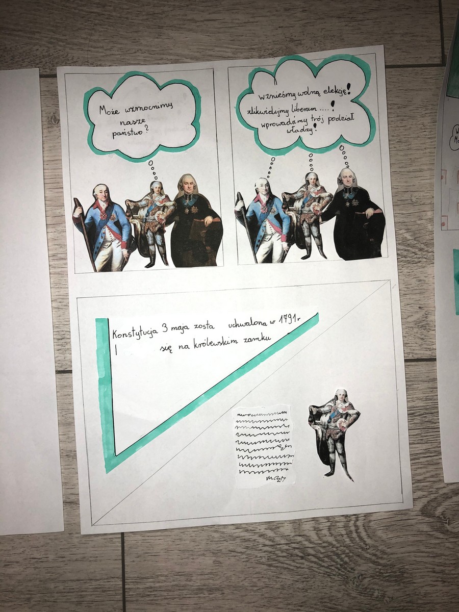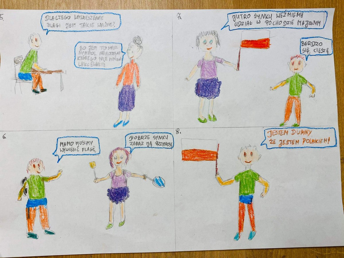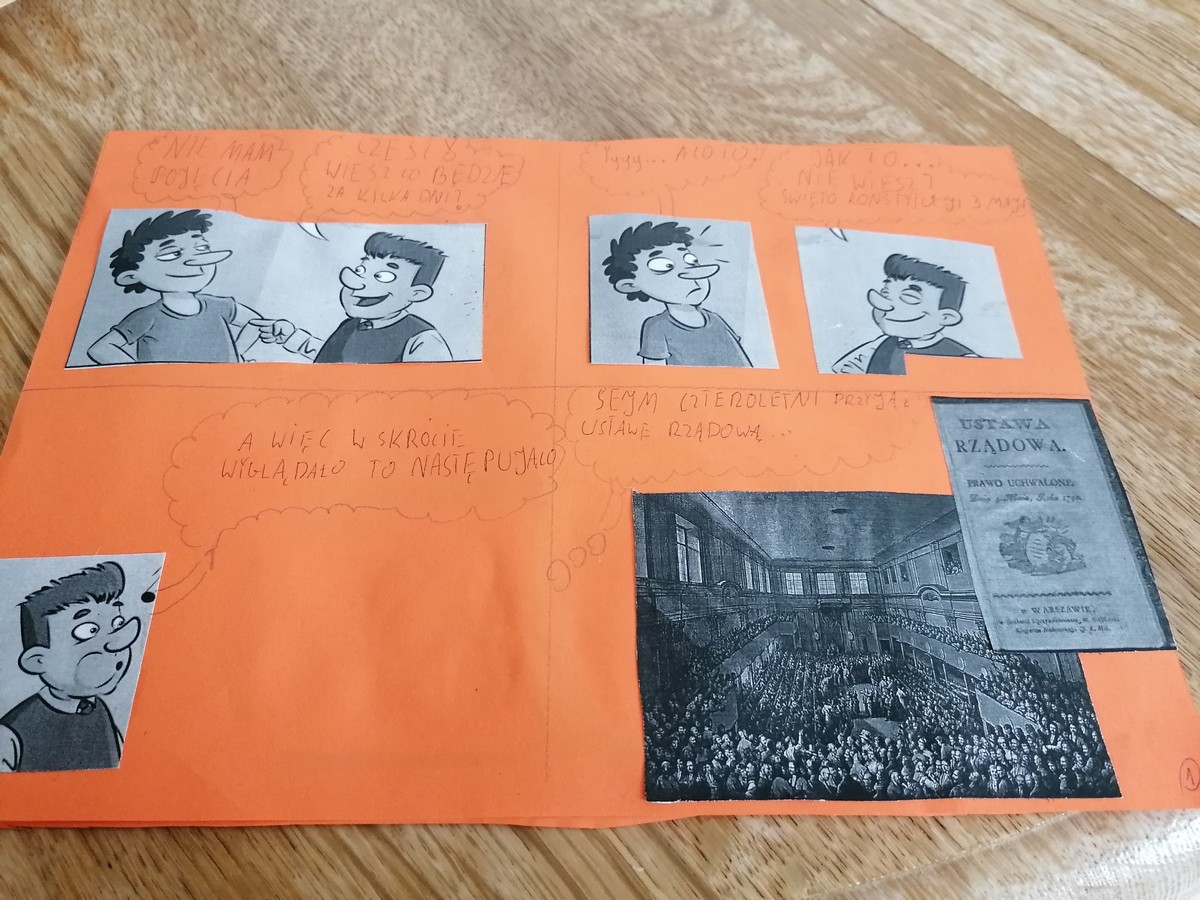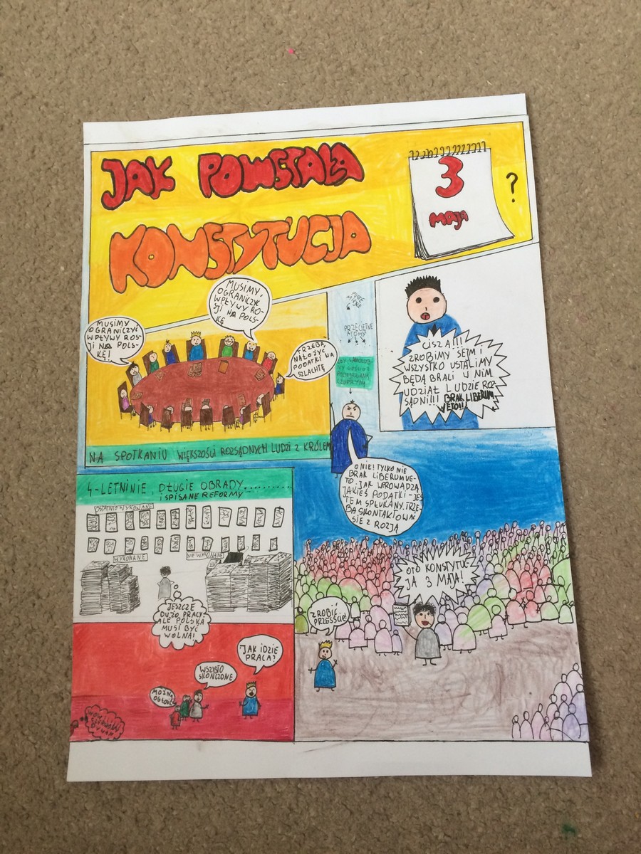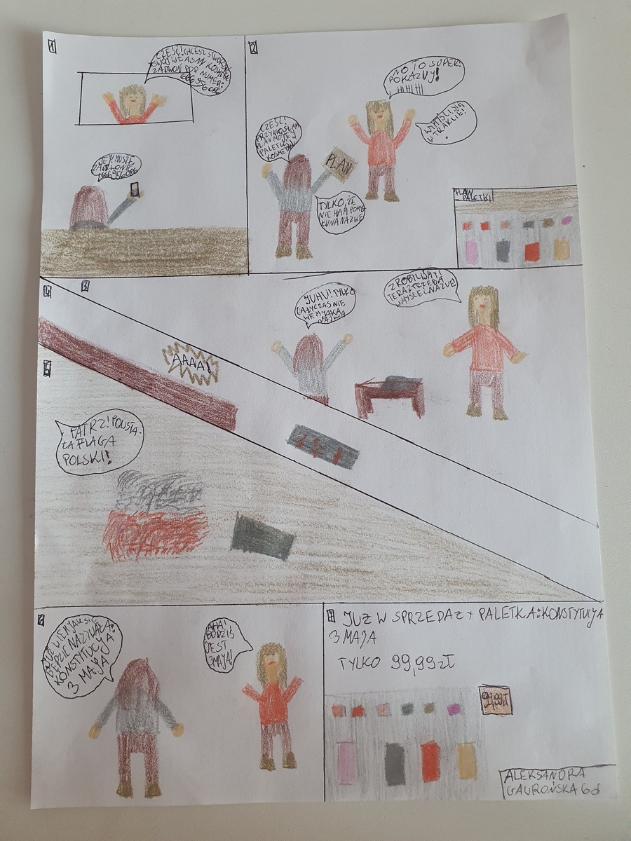 W tym roku uczniowie Szkoły Podstawowej nr 1 im. Henryka Sienkiewicza nie mogli obchodzić tego święta tak, jak to bywało w latach ubiegłych. Uroczyste apele, wystawy, wspólne śpiewanie pieśni patriotycznych nie były możliwe do zrealizowania. Ale to nie oznacza, że można było pominąć ten ważny w kalendarzu imprez szkolnych dzień. Uczniowie „Jedynki” z tej okazji przygotowali komiksy. Każdy zawierał ciekawostki na temat obchodzonego święta lub pomysły na świętowanie w dobie pandemii koronawirusa. Pomysłowość uczniów nie miała granic. Twórcy komiksów zaprezentowali m. in. pomysł zorganizowania wirtualnego koncertu, wirtualnego biegu z okazji Święta Konstytucji 3 Maja czy utworzenie zespołu muzycznego „Konstytucja”, którego członkowie to Konsty i Tucja. Młodsi uczniowie wzięli udział w wirtualnej lekcji historii na Zamku Królewskim w Warszawie, a następnie przystąpili do zilustrowania tego ważnego dla państwa polskiego wydarzenia, wyrażając uczucie radości i dumy, że są Polakami.