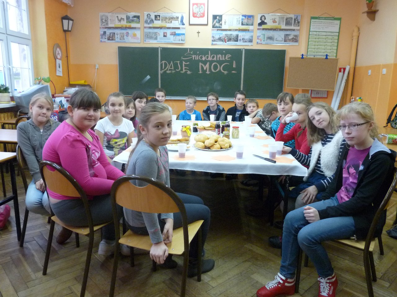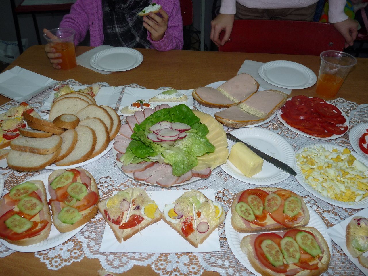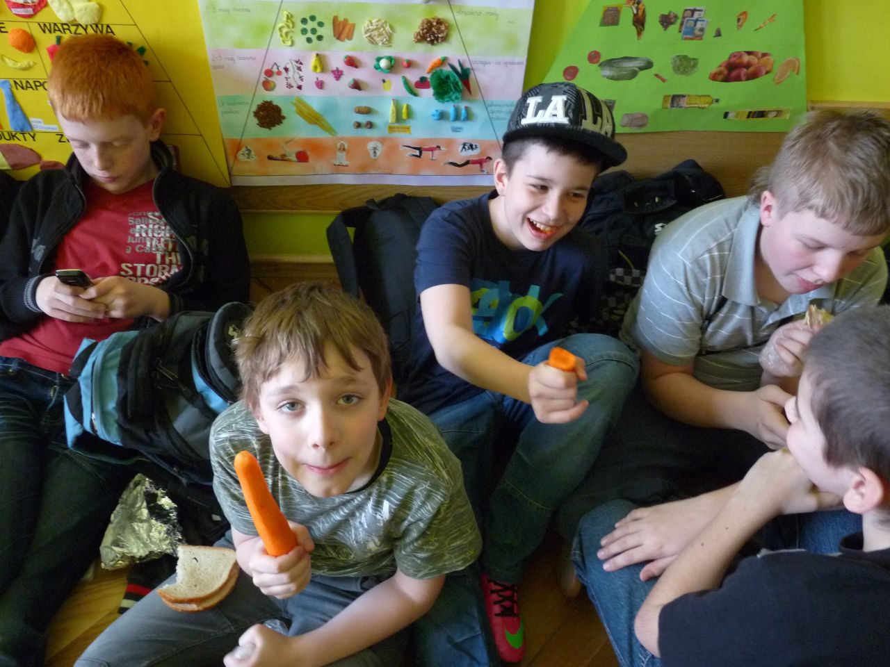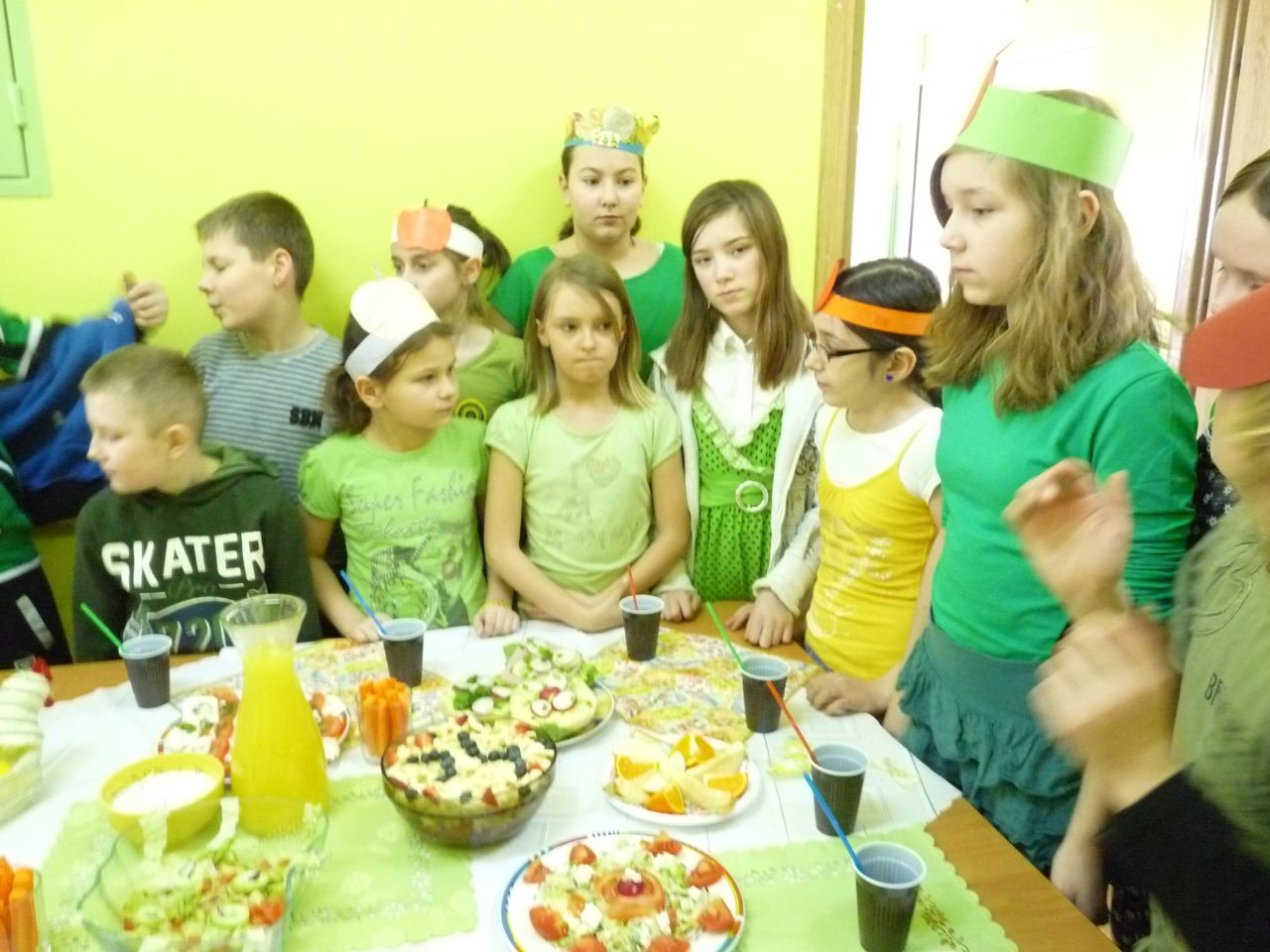 W związku z tym 8 listopada każda klasa w Jedynce wg własnego pomysłu organizowała zdrowe śniadanie. Była to świetna zabawa o dużych walorach edukacyjnych. Dzieci z apetytem jadły ciemne pieczywo z gzikiem lub domowymi konfiturami. Dużym powodzeniem ciszyły się sałatki owocowe i warzywne, kolorowe kanapki a do picia kompoty i domowej roboty soki. W tym dniu zamiast chipsów dzieci chrupały marchew, zamiast słodkich groszków wyciągały rękę po winogrono.