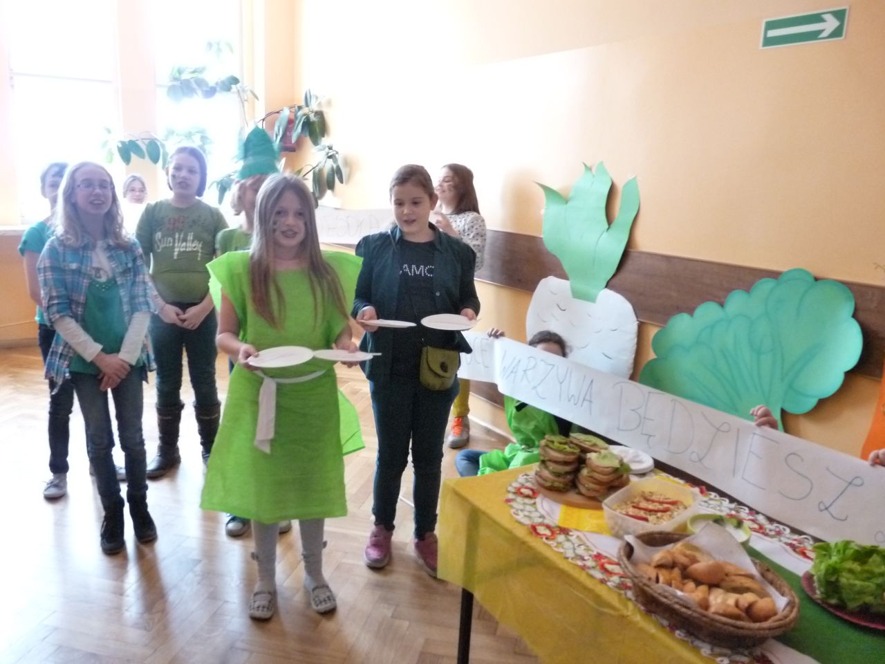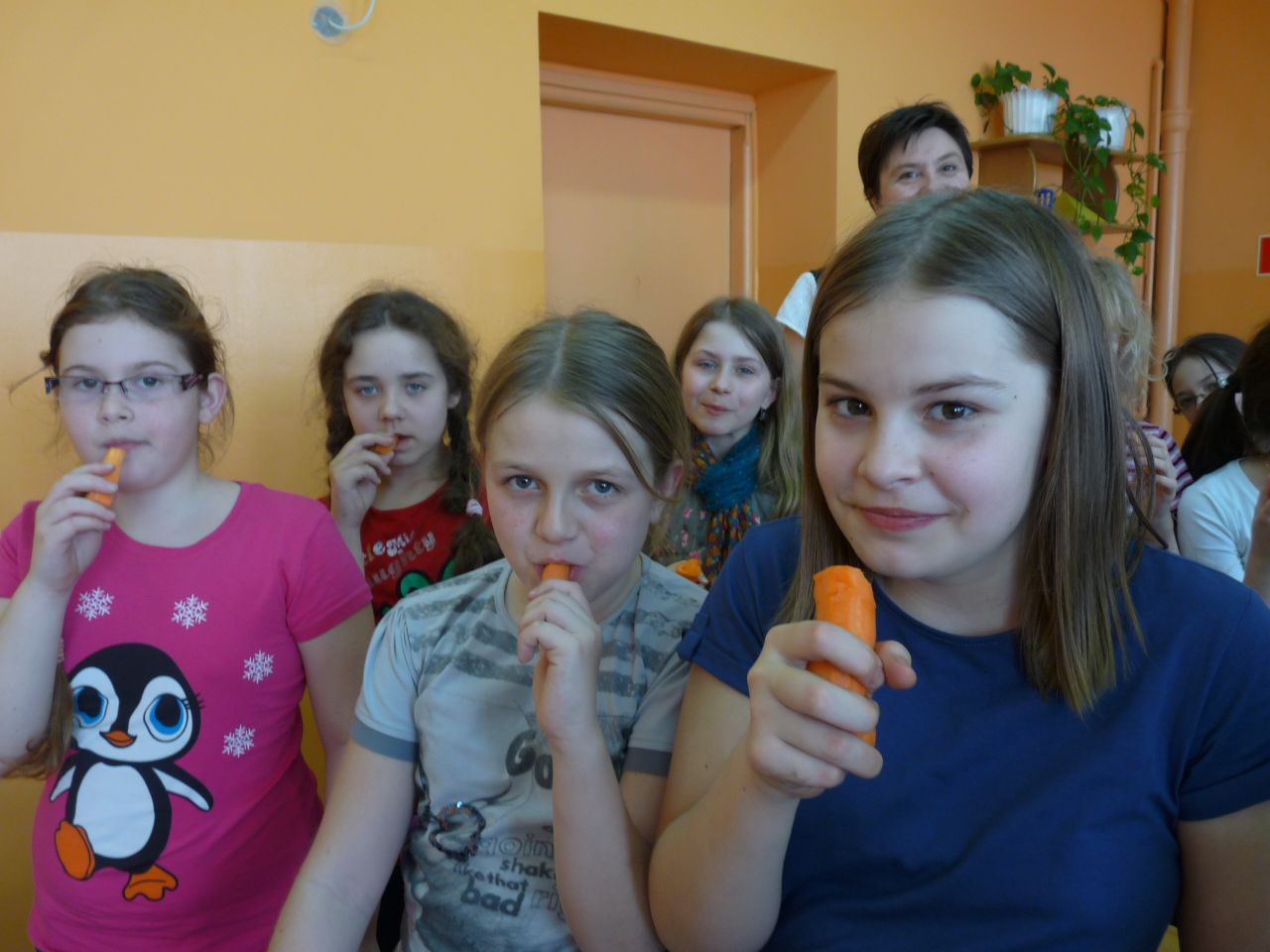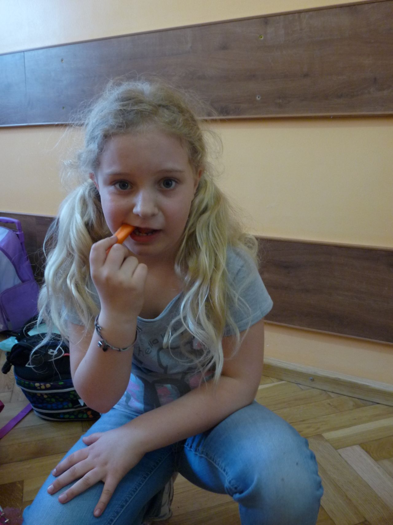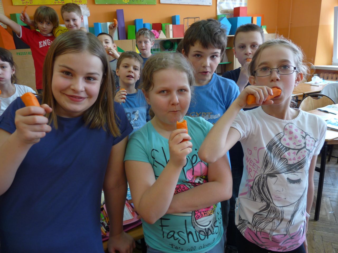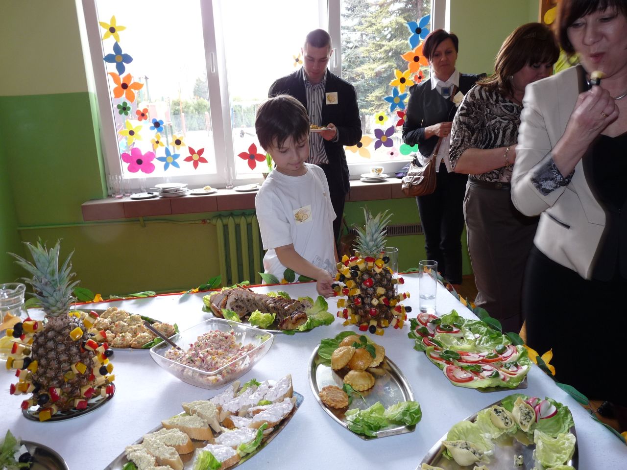 W związku z tym 8 listopada każda klasa w Jedynce wg własnego pomysłu organizowała zdrowe śniadanie. Była to świetna zabawa o dużych walorach edukacyjnych. Dzieci z apetytem jadły ciemne pieczywo z gzikiem lub domowymi konfiturami. Dużym powodzeniem ciszyły się sałatki owocowe i warzywne, kolorowe kanapki a do picia kompoty i domowej roboty soki. W tym dniu zamiast chipsów dzieci chrupały marchew, zamiast słodkich groszków wyciągały rękę po winogrono.