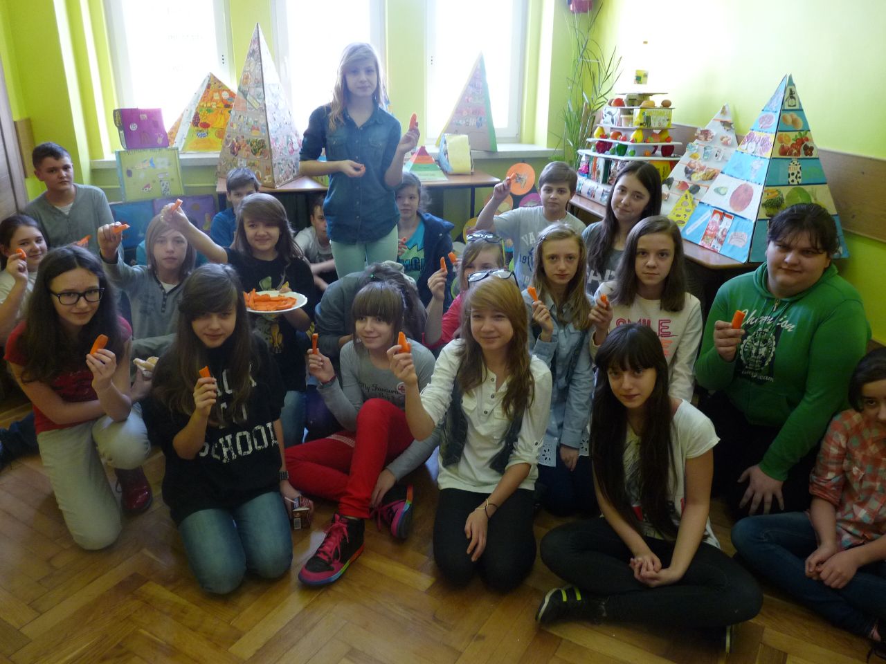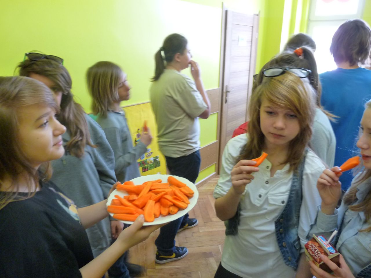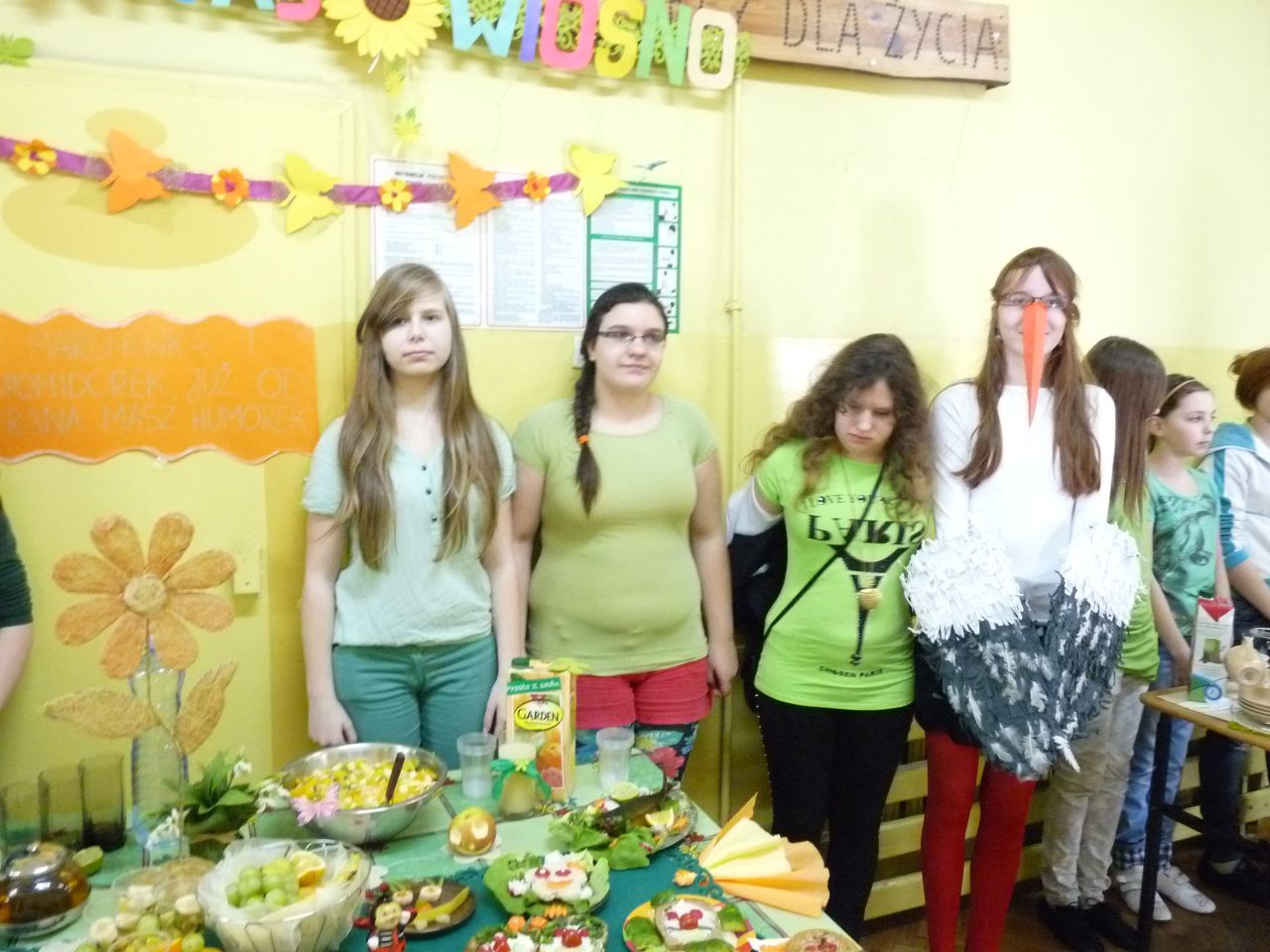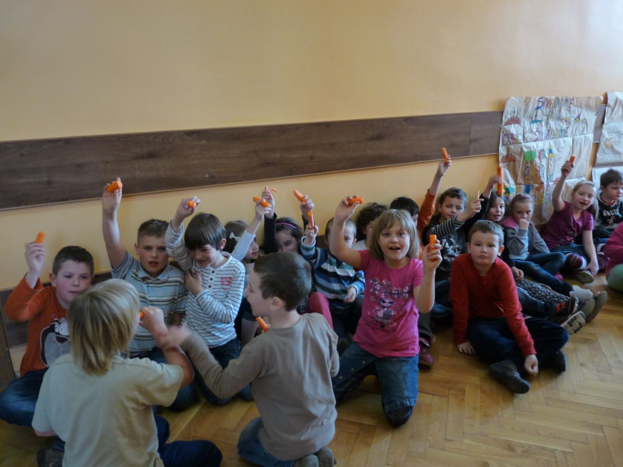W związku z tym 8 listopada każda klasa w Jedynce wg własnego pomysłu organizowała zdrowe śniadanie. Była to świetna zabawa o dużych walorach edukacyjnych. Dzieci z apetytem jadły ciemne pieczywo z gzikiem lub domowymi konfiturami. Dużym powodzeniem ciszyły się sałatki owocowe i warzywne, kolorowe kanapki a do picia kompoty i domowej roboty soki. W tym dniu zamiast chipsów dzieci chrupały marchew, zamiast słodkich groszków wyciągały rękę po winogrono.