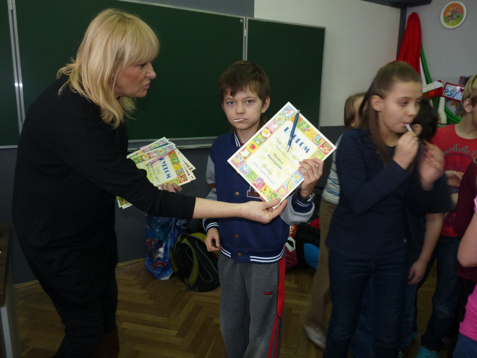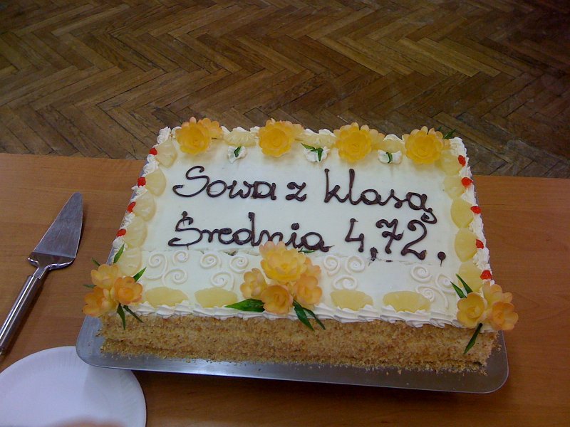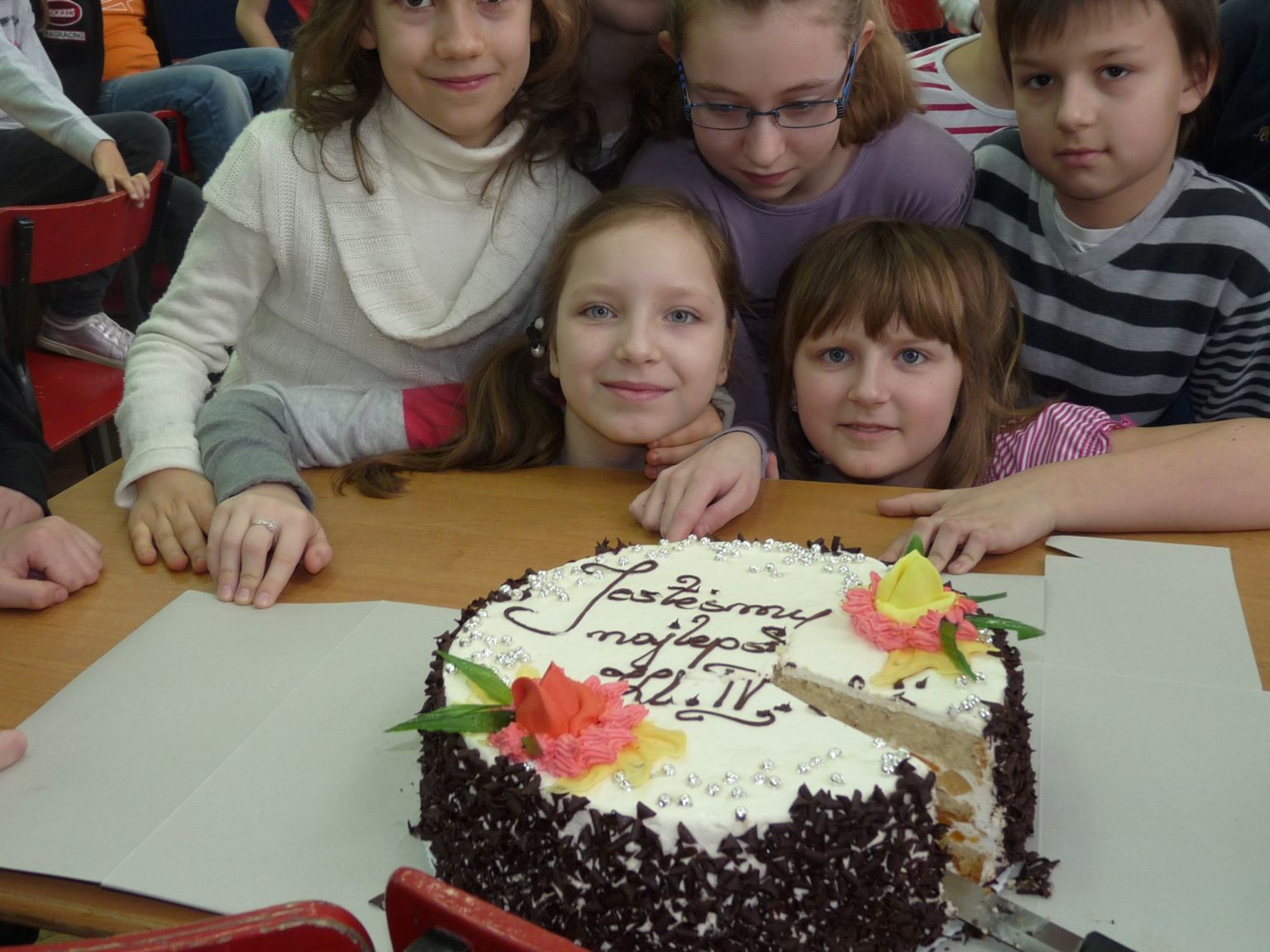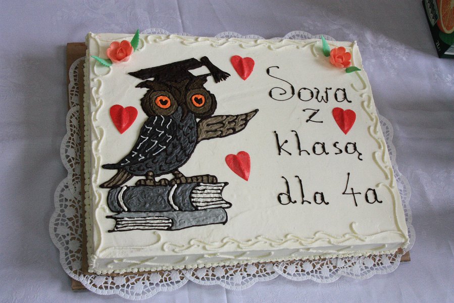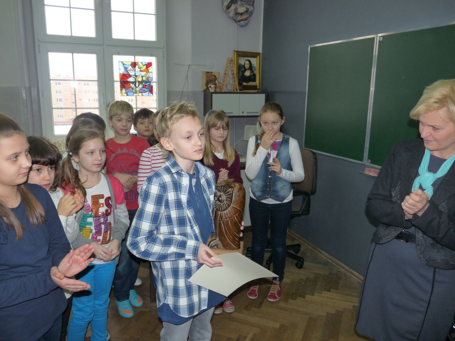 Po zakończeniu I semestru najwyższą średnią ocen uzyskali uczniowie klasy 4d – 4,72. Podczas lekcji wychowawczej pani dyrektor Elżbieta Pokojowa oraz uczniowie klasy 5a w obecności rodziców i wychowawczyni klasy przekazali dzieciom statuetkę „Sowy z klasą”  i dyplom za najwyższa średnią. Na pamiątkę tej niezwykle sympatycznej uroczystości rodzice przygotowali wspaniały tort i plakietki dla wszystkich uczniów i wychowawczyni. Gratulujemy sukcesu i życzymy dalszych tak wysokich wyników w nauce! Miejmy nadzieję, że „Sowa z klasą” zagości w 4d na dłużej.
