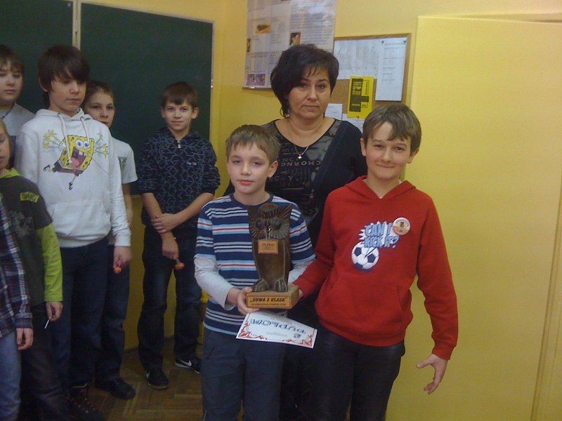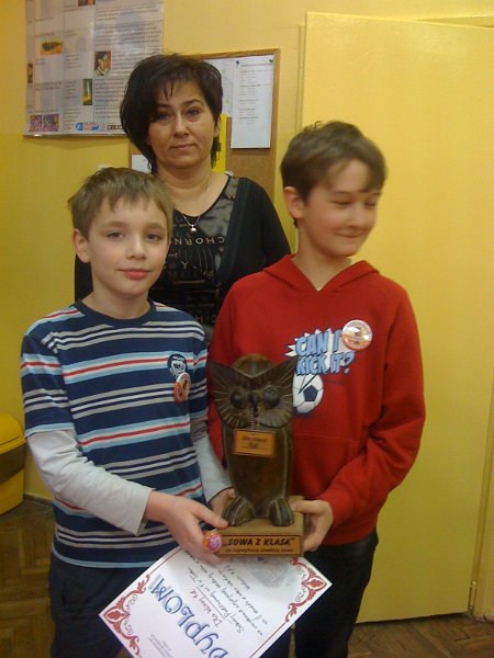 Długo zastanawialiśmy się jak powinien wyglądać przechodni puchar dla najlepszej klasy. Były różne propozycje, ale żadna nie wydawała się nam wystarczająco dobra. Pomysł przyszedł sam. Podczas przypadkowych zakupów pani Aldona Piwońska natknęła się na przepiękną, drewnianą rzeźbę sowy, wiedzieliśmy że to właśnie musi być ona. Sowa to przecież symbol mądrości. Zarówno nauczycielom jak i uczniom podobał się ten pomysł. Ogłosiliśmy wśród uczniów klas IV – VI konkurs na wymyślenie nazwy dla naszej sowy. Konkurs wzbudził duże zainteresowanie, uczniowie wrzucali karteczki ze swymi pomysłami do puszki wystawionej na korytarzu. Wyboru nazwy dla naszej sowy dokonała komisja składająca się z trzech uczniów i trzech nauczycieli. Wszyscy jednogłośnie wybrali dla statuetki nazwę „Sowa z klasą”. Autor tej nazwy za najciekawszą propozycję otrzymał na uroczystości zakończenia roku szkolnego pamiątkową nagrodę.