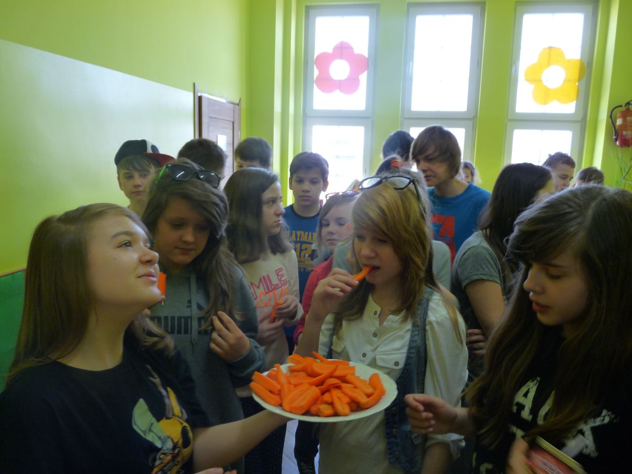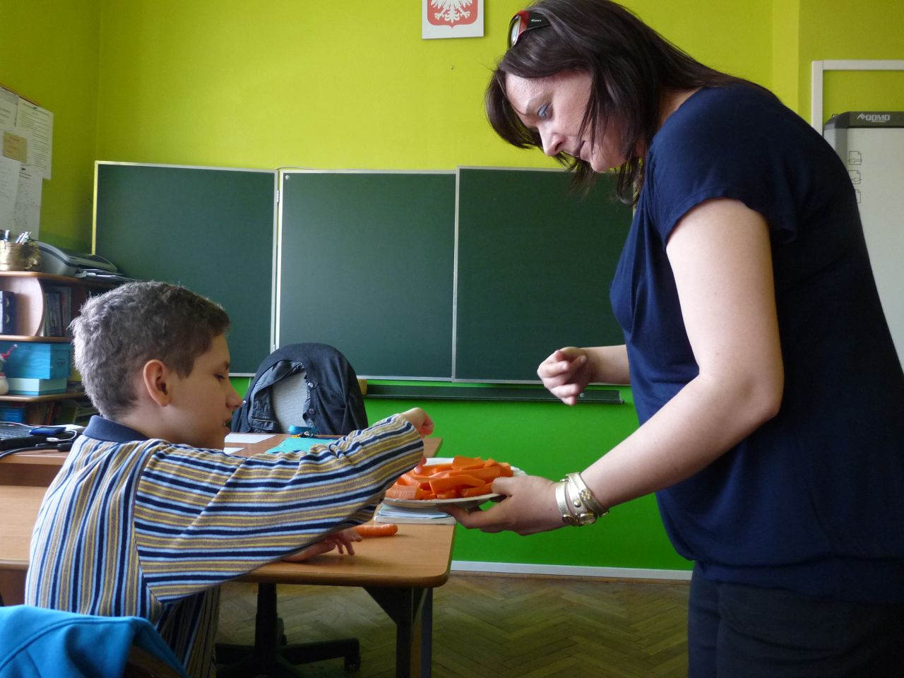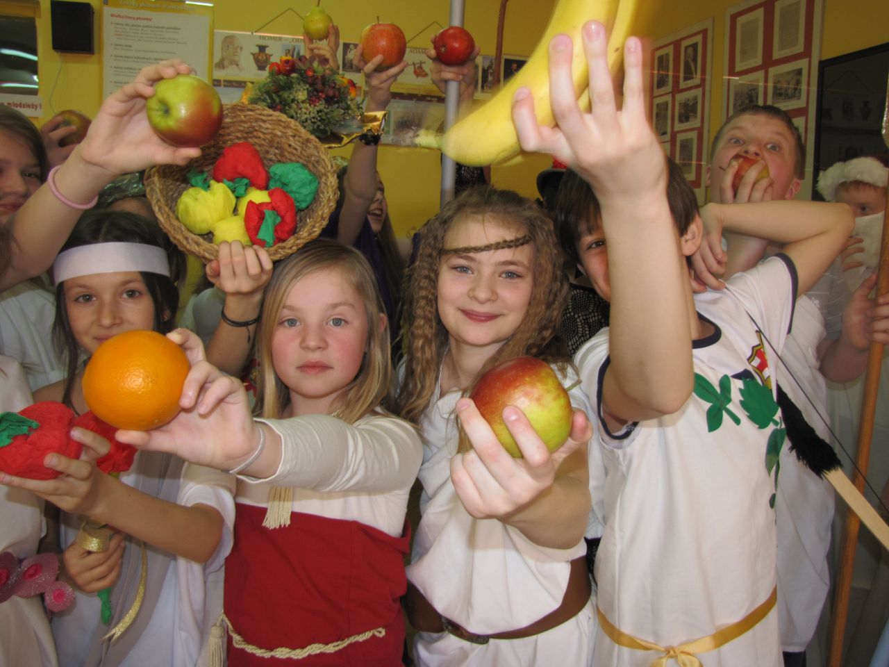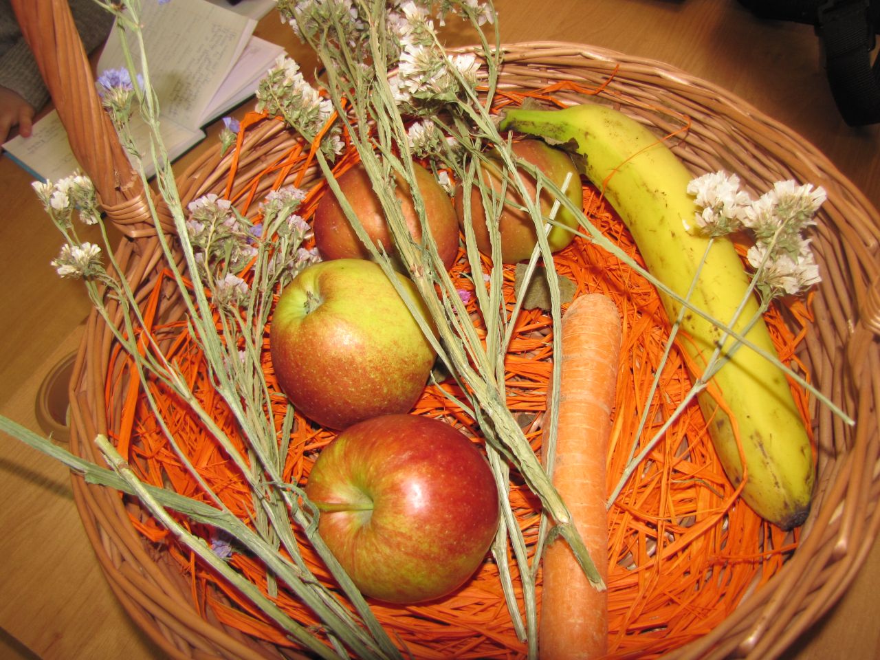 Lekcja języka polskiego była ciekawa również z tego względu, że uczestniczyli w niej uczniowie klas I, II i IV. Uczniowie świetnie ze sobą współpracowali.. Zadania były tak opracowane, że brali w nich udział zarówno starsi jak i młodsi. Zadań do wykonania było wiele, angażowały do pracy wszystkich uczniów. Dzieci wykazały się dużą wiedzą na temat wartości odżywczych warzyw i owoców. Niektóre dzieci próbowały dane warzywo lub owoc ze stwierdzeniem, że jedzą coś po raz pierwszy. Lekcja języka polskiego stworzyła okazję do tego aby przekonać uczniów , że jesień ma w sobie całe bogactwo zapachów, kolorów, kształtów a także wartości odżywczych, które są w warzywach i owocach.